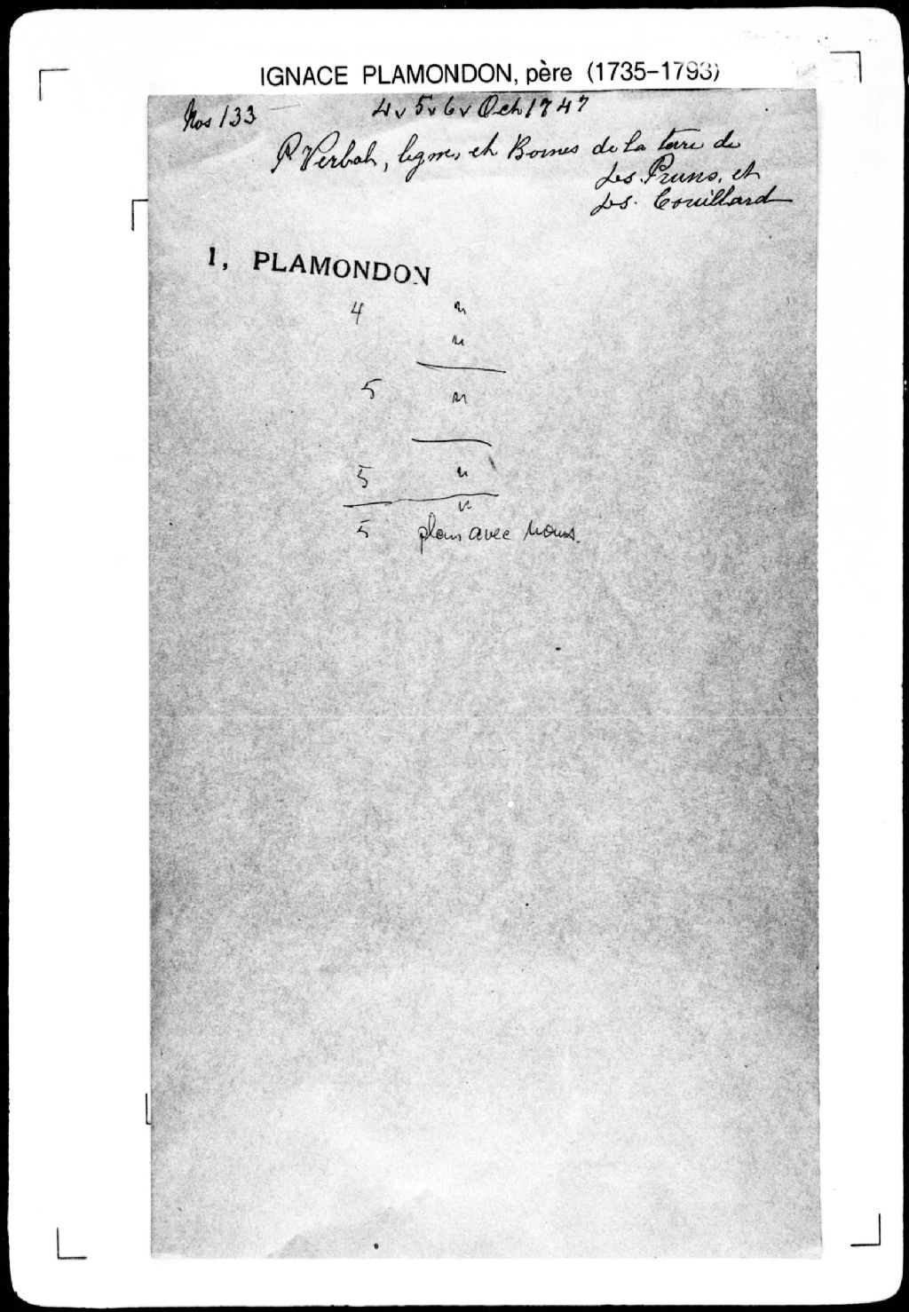 Procès-verbal de borne séparant deux terres situées près du chemin Royal, dans la [seigneurie de Bellechasse]. La présente pièce concerne directement: Louis Blais; Guillaume Guillemet (Guillemette, Guilmet) (arpenteur Ignace Plamondon père), 5 octobre 1747, Archives nationales à Québec, Fonds Cour supérieure. District judiciaire de Québec. Greffes d'arpenteurs, (03Q,CA301,S43,P133-3).