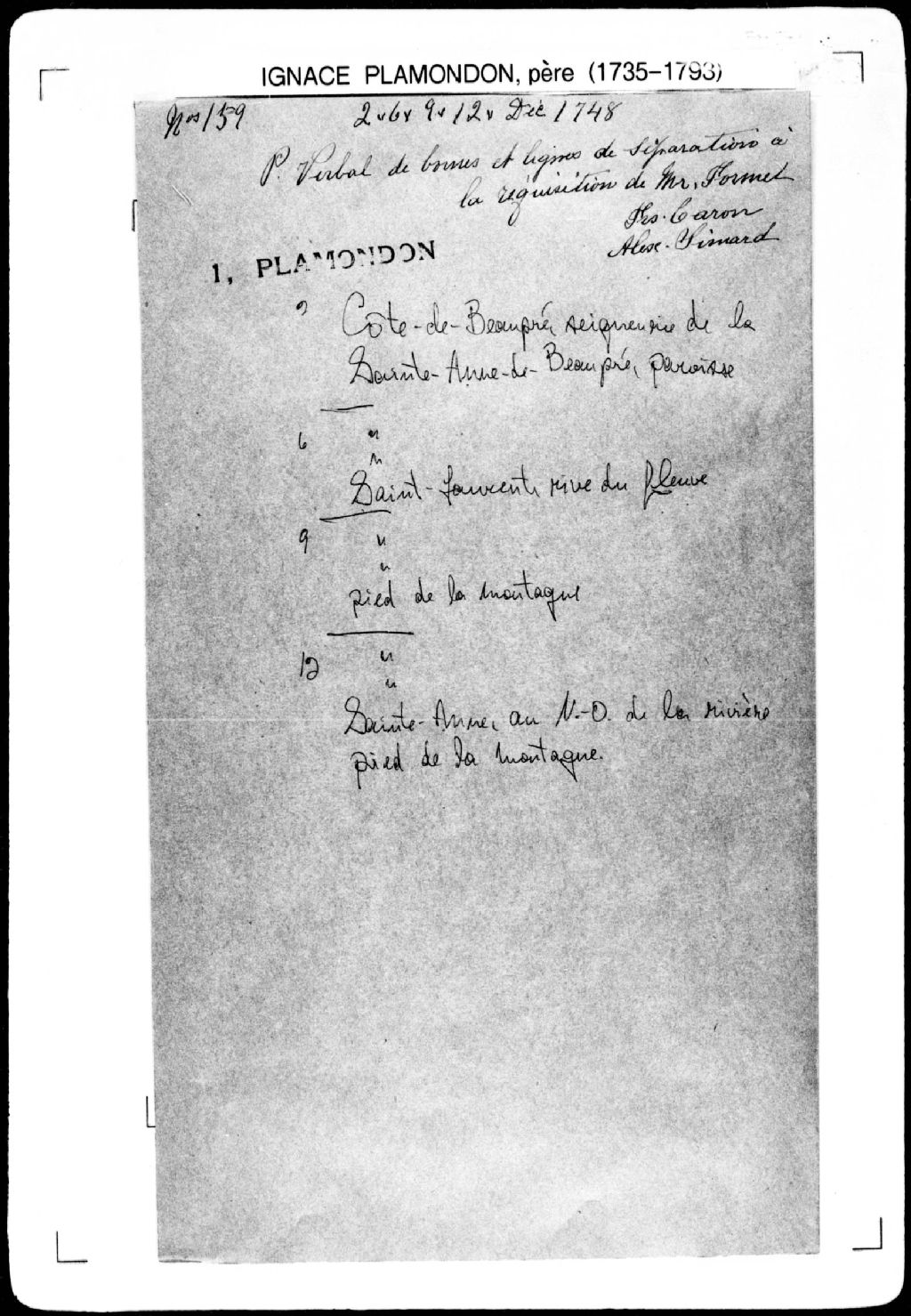 Procès-verbal de ligne et borne séparant deux terres jusqu'au pied de la montagne distante d'environ une lieue du fleuve Saint-Laurent, lesquelles terres étant situées au nord-ouest de la grande Rivière, dans la [paroisse de Sainte-Anne], [seigneurie de la Côte-de-Beaupré]. La présente pièce concerne directement: la dame Fornel (Fournel), [demeurant en la ville de Québec]; Pierre Chabot; Joseph Duchaisne (Duchesne) (arpenteur Ignace Plamondon père), 12 décembre 1748, Archives nationales à Québec, Fonds Cour supérieure. District judiciaire de Québec. Greffes d'arpenteurs, (03Q,CA301,S43,P159-4).
