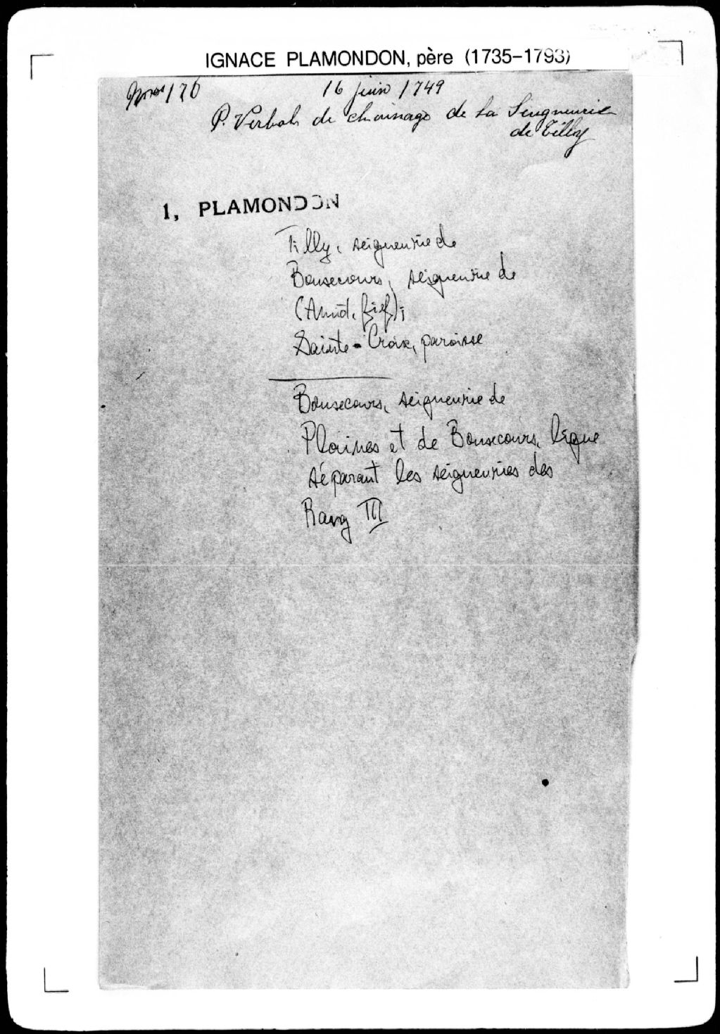 - La pièce se compose du procès-verbal de chaînage du front de onze terres à partir de la ligne qui sépare le fief de Belle-Plaine (seigneurie des Plaines) du fief Bonsecours et de ligne et bornes séparant deux desdites terres, lesquelles terres étant situées à la troisième concession, dans la seigneurie de Bonsecours. Elle concerne directement: François Marote (Marotte, Marot); Joseph Chauret (Choret); François Grenier; Jacques-Charles Houde (Houle); les nommés Bellefeuiel (Bellefeuille); Pierre Champagne; Pierre Demer (Demers); Jean-Joseph Houde (Houle); Simon Houde (Houle).