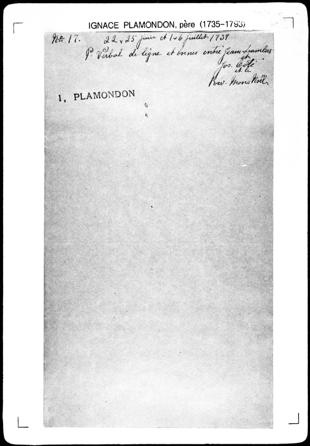 Procès-verbal de ligne et borne séparant deux terres situées dans la seigneurie de Bonsecours. La présente pièce concerne directement: Jean Bergeron; Claude Houle (Houde) (arpenteur Ignace Plamondon père), 1er juillet 1739, Archives nationales à Québec, Fonds Cour supérieure. District judiciaire de Québec. Greffes d'arpenteurs, (03Q,CA301,S43,P17-4).