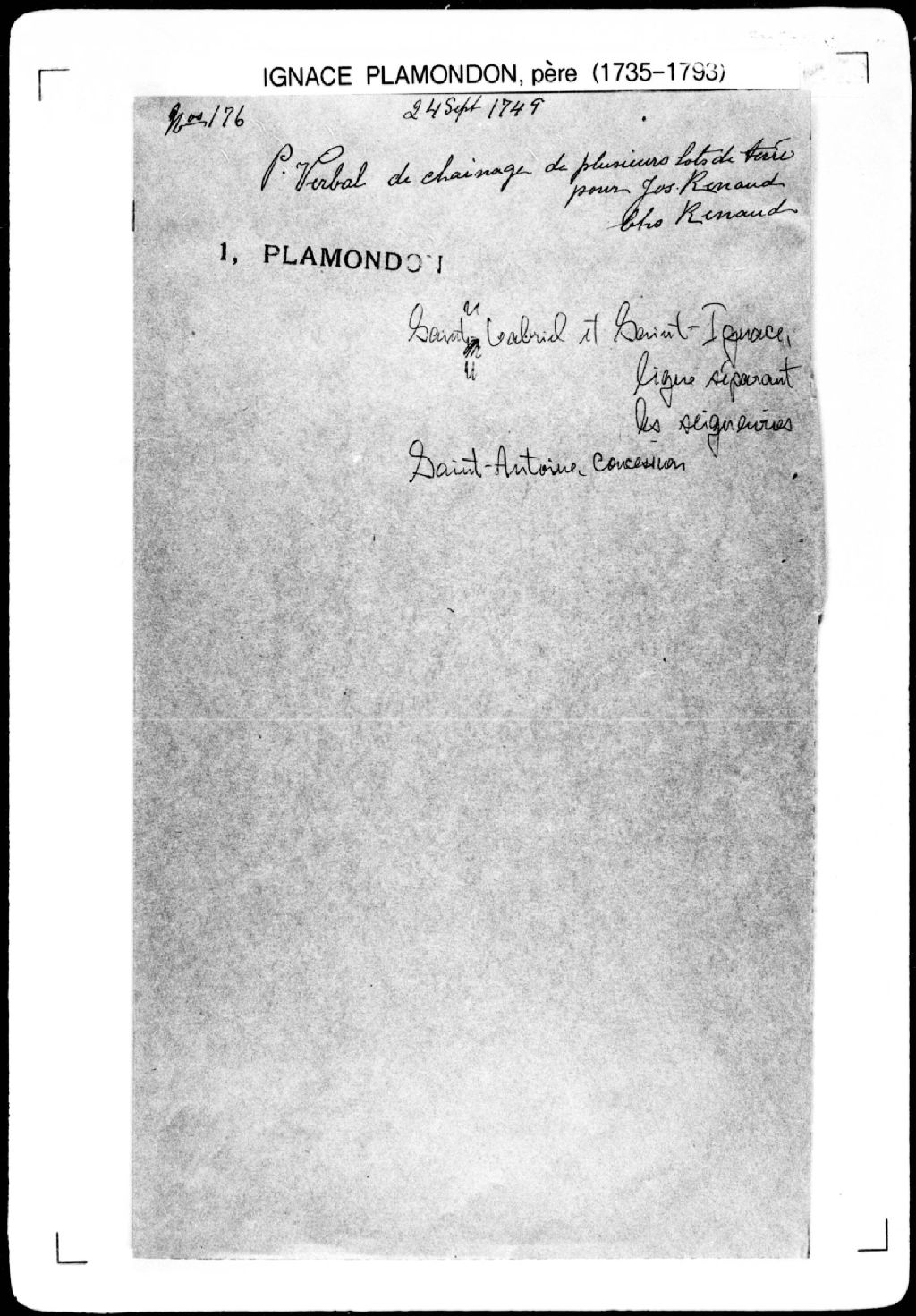 - La pièce se compose du procès-verbal et plan figuratif de chaînage de la profondeur de deux concessions sur la ligne qui sépare la seigneurie de Saint-Gabriel du fief Saint-Ignace, à partir de la côte Saint-Antoine jusqu'à la rivière Saint-Charles, et de chaînage de quatre terres à partir de ladite ligne seigneuriale, lesquelles terres étant situées dans la seigneurie de Saint-Gabriel. Elle concerne directement: Joseph Renaud; Charles Renaud; Louis Renaud; Pierre Veret (Verret, Verrette) et indirectement un propriétaire voisin: Pierre Bernard.Le document comporte un procès-verbal et un plan des lots situés dans la concession Saint-Barthélemy de la seigneurie Saint-Gabriel. Figurent sur ce dernier la rivière Saint-Charles, la dimension des lots ainsi que les noms Joseph Renaud, Charles Renaud, Louis Renaud et Pierre Verret