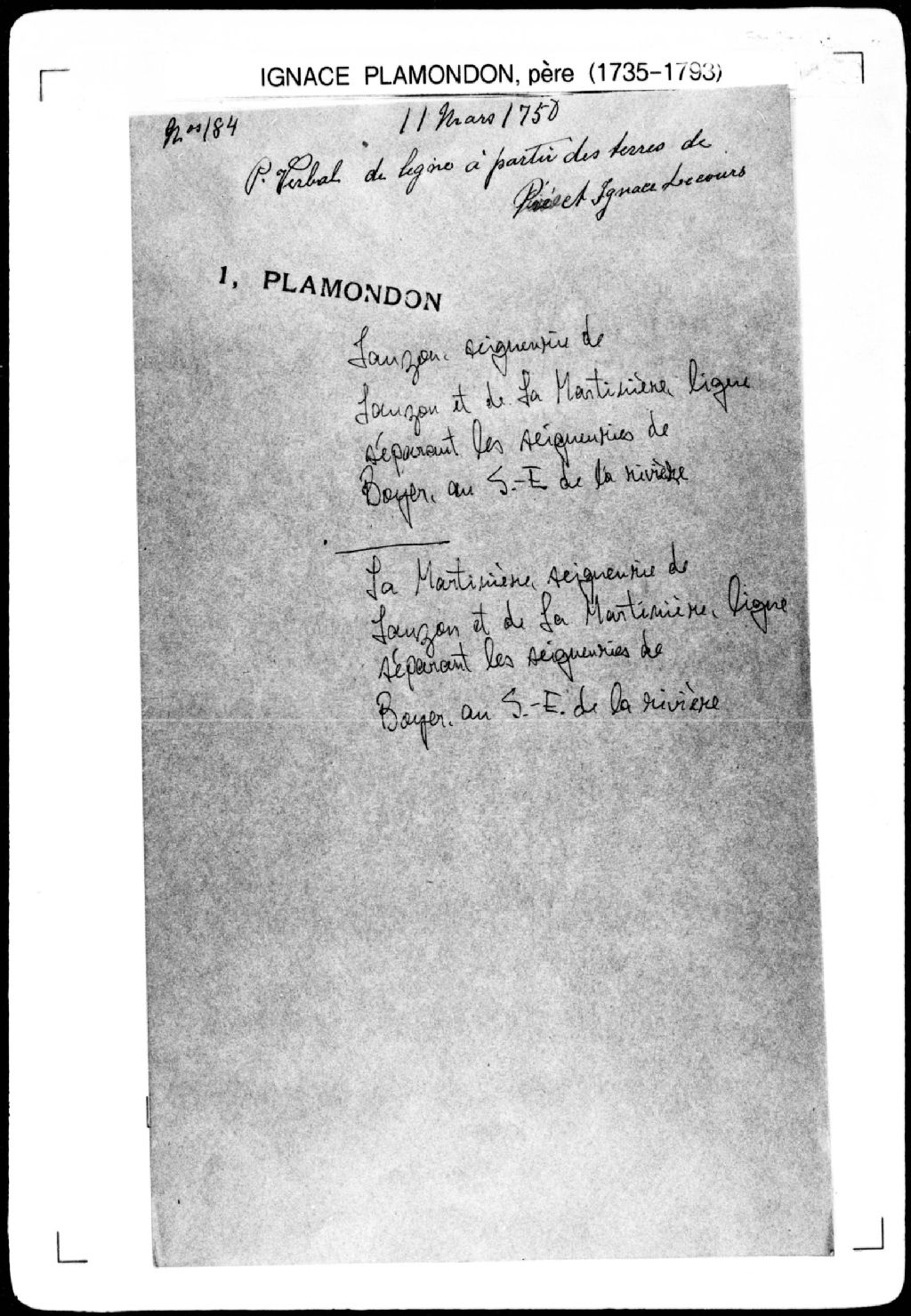 Procès-verbal de chaînage, lignes et bornes de deux terres à commencer à la ligne qui sépare la seigneurie de Lauzon de la seigneurie de La Martinière, lesquelles terres étant situées au nord-est de la seigneurie de Lauzon, sur le bras du sud de la rivière Boyer, au sud-est de ladite rivière Boyer, dans la seigneurie de La Martinière. La présente pièce concerne directement: Joseph Lepage; Pierre Labrecque (arpenteur Ignace Plamondon père), 13 mars 1750, Archives nationales à Québec, Fonds Cour supérieure. District judiciaire de Québec. Greffes d'arpenteurs, (03Q,CA301,S43,P184-2).