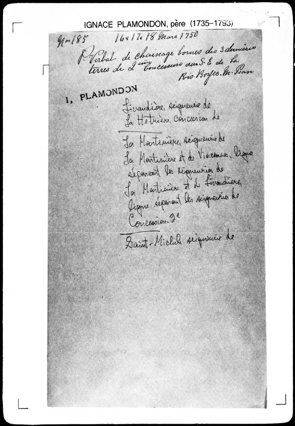 Procès-verbal de chaînage, lignes et bornes des trois dernières terres de la deuxième concession, lesquelles terres étant situées au-sud est de la rivière Boyer, dans la seigneurie de Livaudière. La présente pièce concerne directement: le sieur Péan, aide-major des ville et château de Québec, propriétaire de la seigneurie de Livaudière (arpenteur Ignace Plamondon père), 16 mars 1750, Archives nationales à Québec, Fonds Cour supérieure. District judiciaire de Québec. Greffes d'arpenteurs, (03Q,CA301,S43,P185-1).