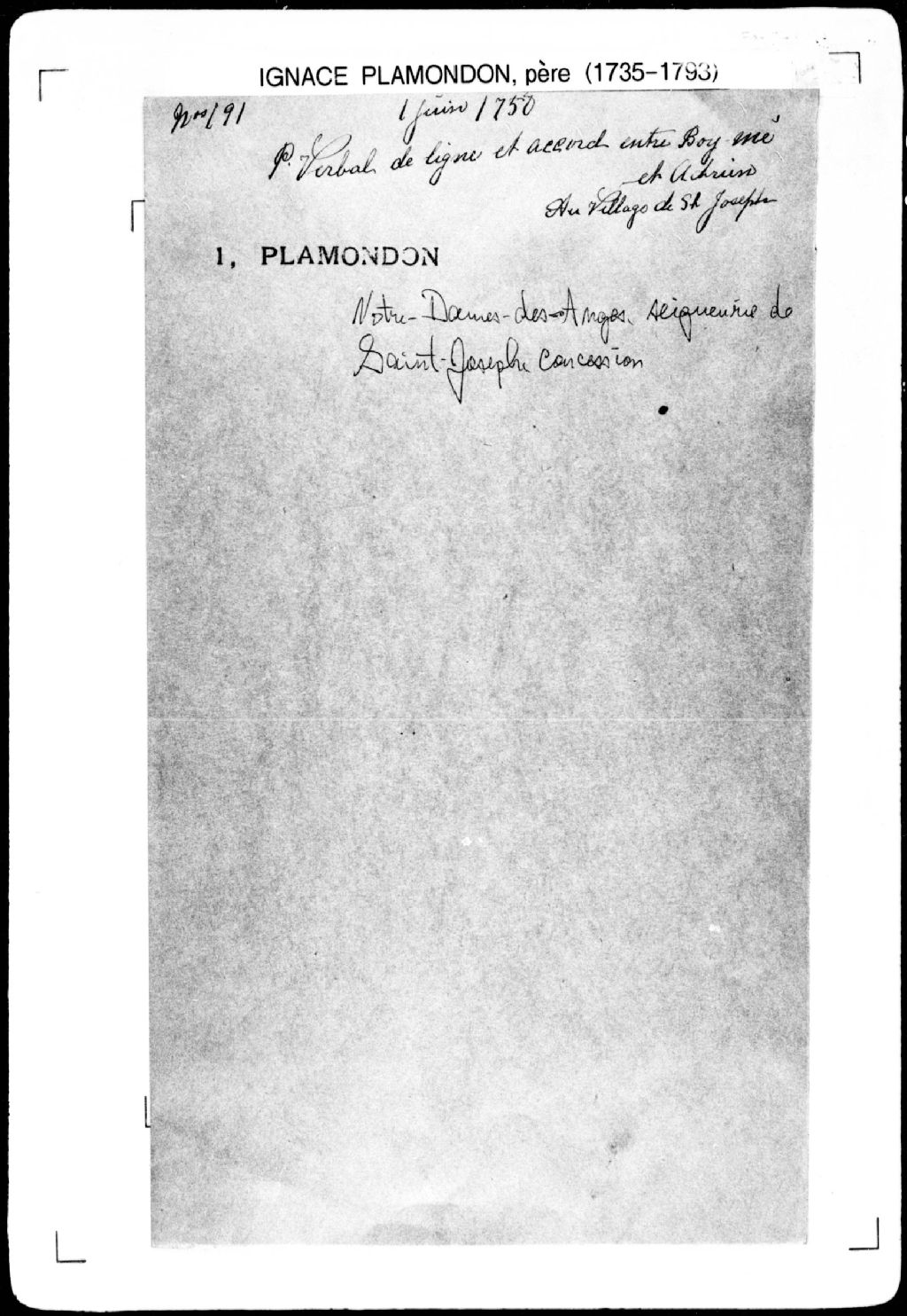 - Notes d'arpentage relatives à la division de terres situées dans la seigneurie de Notre-Dame-des-Anges. La présente pièce concerne directement: François Delage dit Lavigeur (Lavigueur); Augustin Normand; Prisque Lessard; Jean Vermet (arpenteur Ignace Plamondon père)