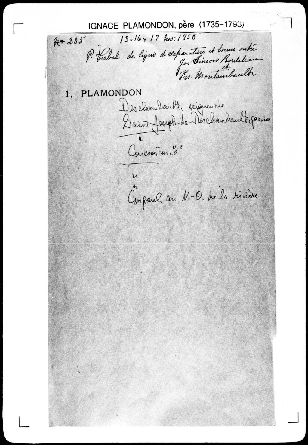 Procès-verbal de ligne et bornes séparant deux terres situées au bord du chemin Royal, dans la paroisse de Saint-Joseph, seigneurie de Deschambault. La présente pièce concerne directement: Joseph-Simon Bordelaye (Bordelais, Bourdelais); François Montenbeau (Montambault) (arpenteur Ignace Plamondon père), 13 novembre 1750, Archives nationales à Québec, Fonds Cour supérieure. District judiciaire de Québec. Greffes d'arpenteurs, (03Q,CA301,S43,P205-1).