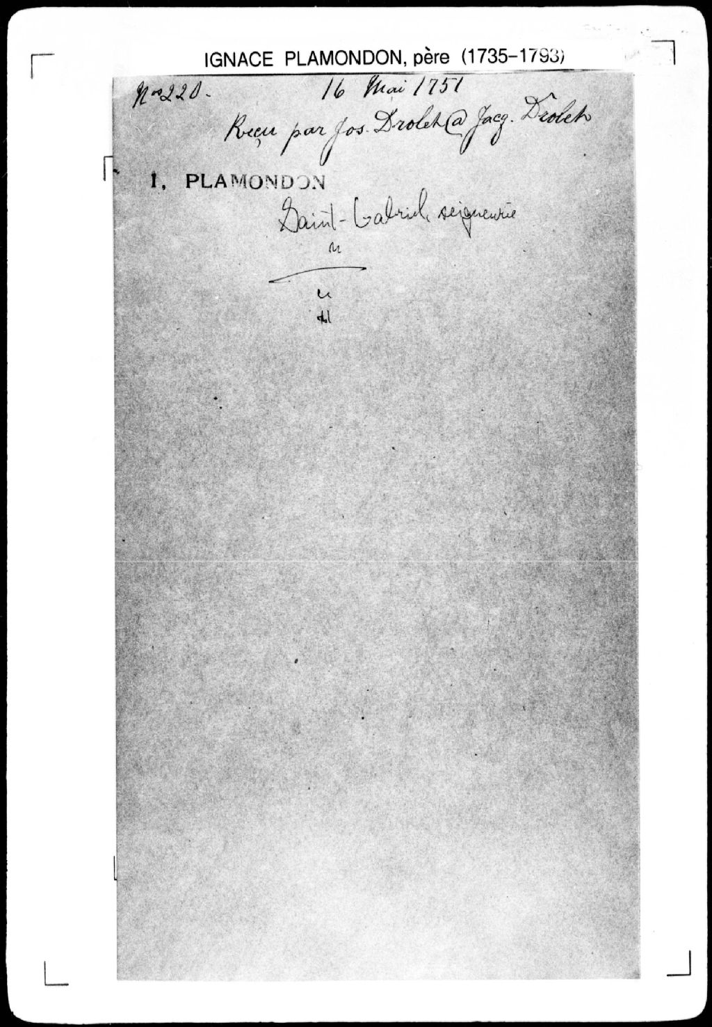 Reçu de Romain Robitaille en faveur de Joseph Drolet quant au versement de 103 livres 15 sols pour l'affermage d'une terre (bail à ferme), laquelle terre étant située dans la paroisse de L'Ancienne-Lorette, seigneurie de Saint-Gabriel. La présente pièce concerne directement: Romain Robitaille; Joseph Drolet, tuteur de la femme de Romain Robitaille (arpenteur Ignace Plamondon père), 16 mai 1751, Archives nationales à Québec, Fonds Cour supérieure. District judiciaire de Québec. Greffes d'arpenteurs, (03Q,CA301,S43,P220-2).