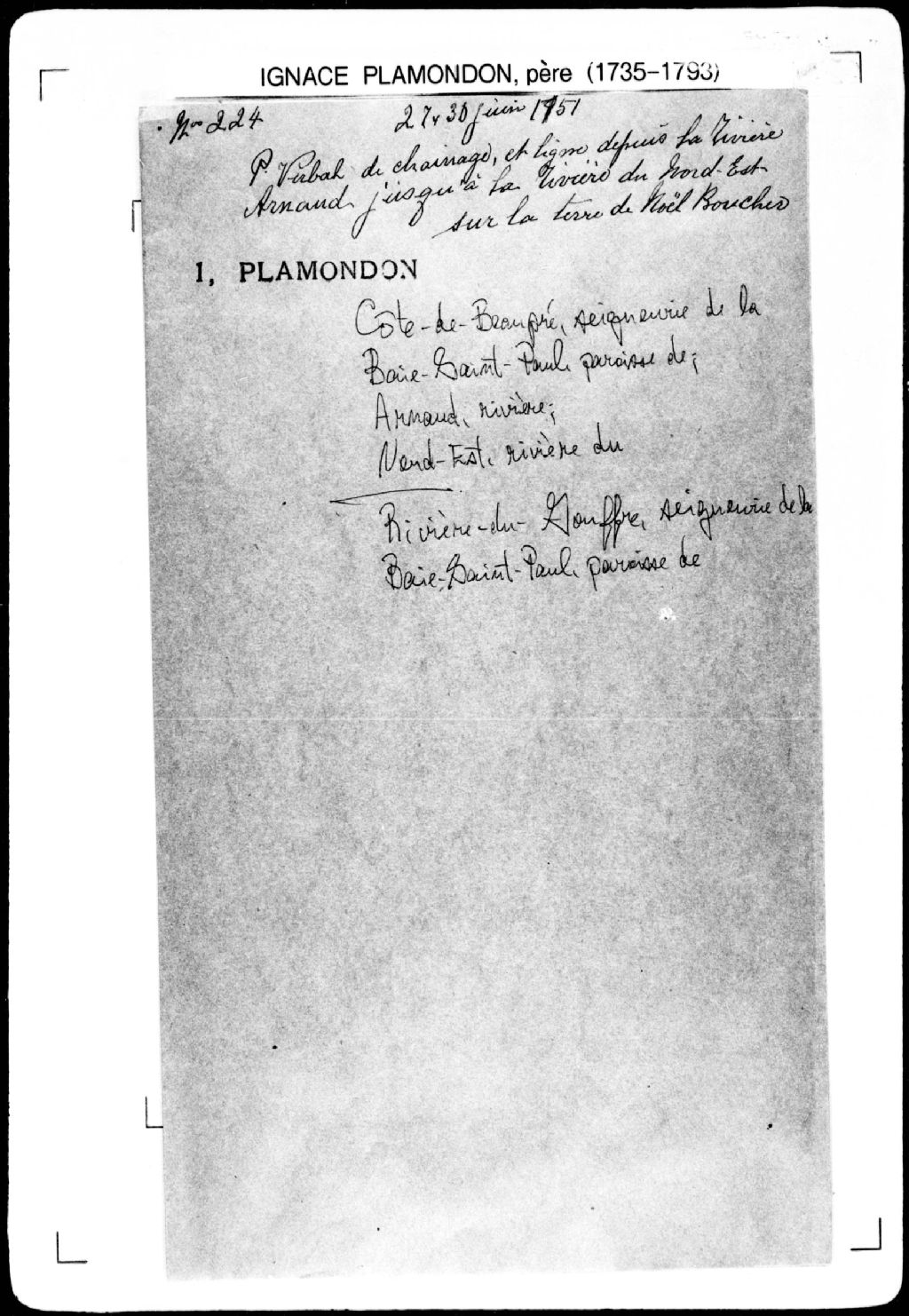Procès-verbal de ligne et bornes séparant deux terres situées au nord-est de la rivière du Gouffre, à la Baie-Saint-Paul, dans la seigneurie de la Rivière-du-Gouffre. La présente pièce concerne directement: Pierre Bazin, marchand négociant en la ville de Québec; Cécile Simard, fille de Noël Simard et épouse de François Bernard de Lafontaine; François Bernard de Lafontaine, époux de Cécile Simard (arpenteur Ignace Plamondon père), 30 juin 1751, Archives nationales à Québec, Fonds Cour supérieure. District judiciaire de Québec. Greffes d'arpenteurs, (03Q,CA301,S43,P224-2).