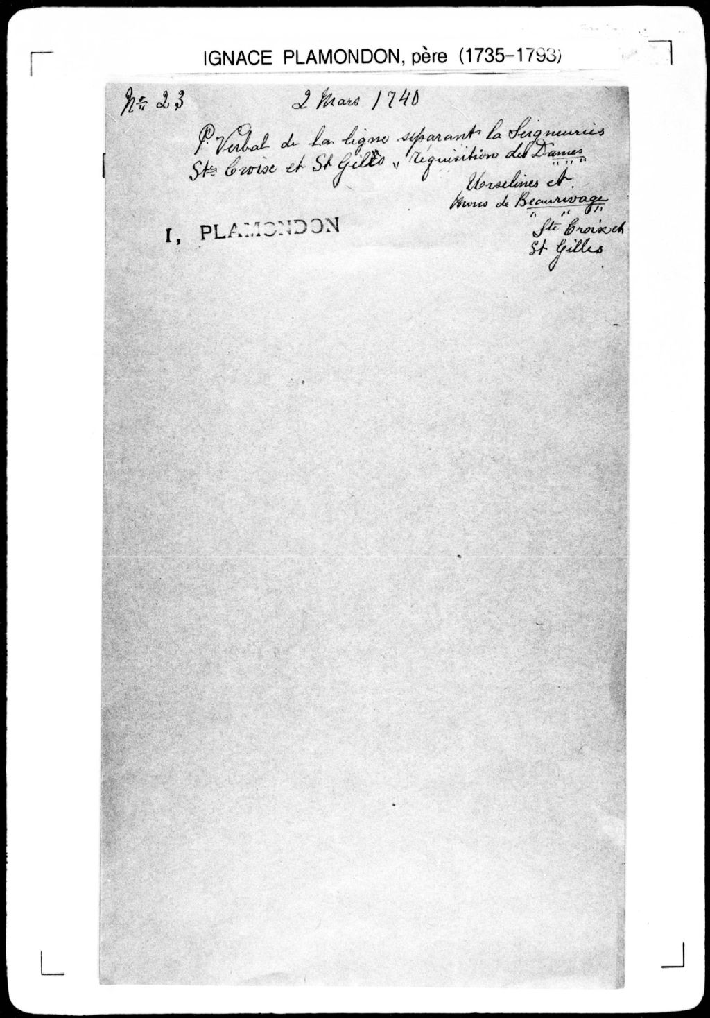 La pièce se compose du procès-verbal de ligne et bornes séparant la seigneurie de Sainte-Croix et la seigneurie de Saint-Gilles à partir de la seigneurie de Tilly, en vertu d'une ordonnance de Gilles Hocquart, intendant de la Nouvelle-France, lesquelles seigneuries étant situées près de Québec, sur le bord du fleuve Saint-Laurent, au sud dudit fleuve, près de la rivière des Aunes (Aulnes, Aulnaies). Elle concerne directement: Gilles Rageot de Beaurivage (Beauxrivages), négociant en la ville de Québec; les Dames Religieuses Ursulines de Québec.La présente pièce concerne indirectement un propriétaire voisin: Geneviève Legardeur (Le Gardeur), propriétaire de la seigneurie de Tilly.