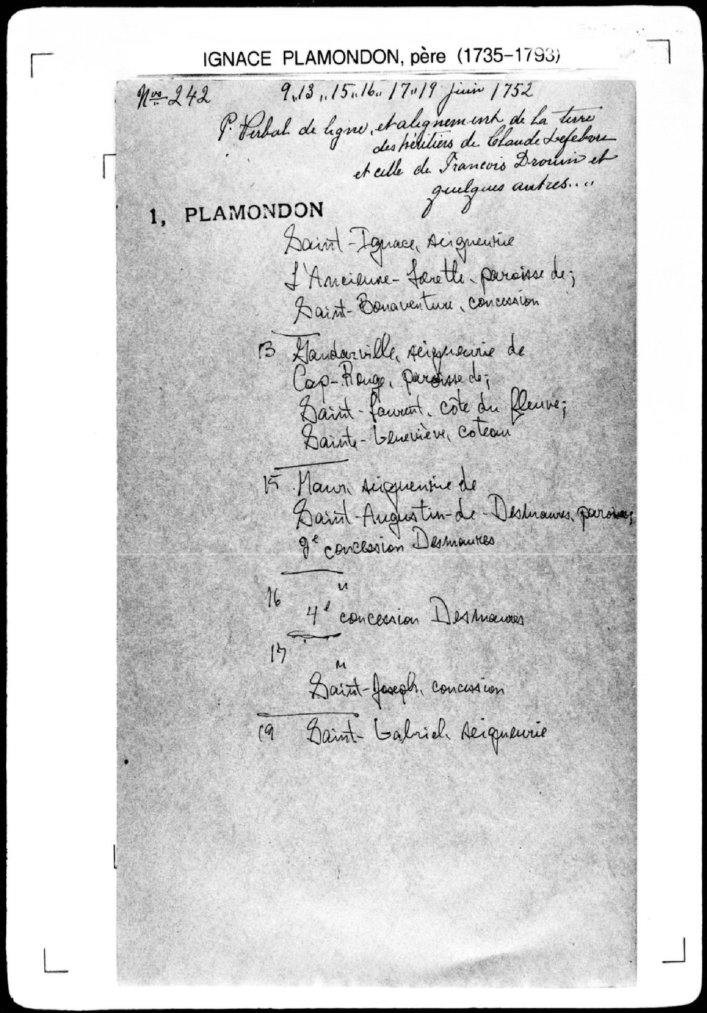Procès-verbal de lignes et bornes séparant une terre d'avec la terre voisine, d'un côté, et d'avec les terres non concédées, de l'autre, lesquelles terres étant situées au second rang, dans la paroisse de Saint-Augustin, seigneurie de Maur. La présente pièce concerne directement: Joseph Chalifou (Chalifour, Chalifoux); Jacques Rocheron (Rochon); l'Hôtel-Dieu de Québec; les Pauvres de l'Hôtel-Dieu de Québec (arpenteur Ignace Plamondon père), 14 juin 1752 - 16 juin 1752, Archives nationales à Québec, Fonds Cour supérieure. District judiciaire de Québec. Greffes d'arpenteurs, (03Q,CA301,S43,P242-2).