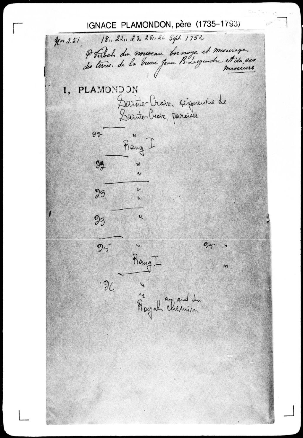 Procès-verbal de chaînage et lignes de quatre terres situées dans la [seigneurie de Sainte-Croix]. La présente pièce concerne directement: Joseph Boisver (Boisvert); Louis Hamel (fils); Pierre Alary (Alarie); Charles Lemay (arpenteur Ignace Plamondon père), 25 septembre 1752, Archives nationales à Québec, Fonds Cour supérieure. District judiciaire de Québec. Greffes d'arpenteurs, (03Q,CA301,S43,P251-8).