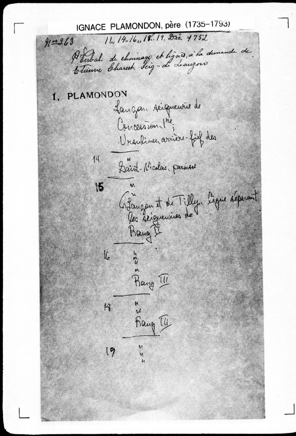 Procès-verbal de chaînage de la profondeur de la première concession depuis le fleuve Saint-Laurent, de ligne et bornes pour la ceinture de deux terres situées à la première concession, sur le bord du fleuve Saint-Laurent, à partir du fief des Dames Religieuses Ursulines, et de chaînage d'un morceau de terre borné par la rivière des Étroits-Chemins (Etchemin), lesquels terres et morceau de terre étant situés dans seigneurie de Lauzon., 11 décembre 1752 - 12 décembre 1752, Archives nationales à Québec, Fonds Cour supérieure. District judiciaire de Québec. Greffes d'arpenteurs, (03Q,CA301,S43,P263-1).