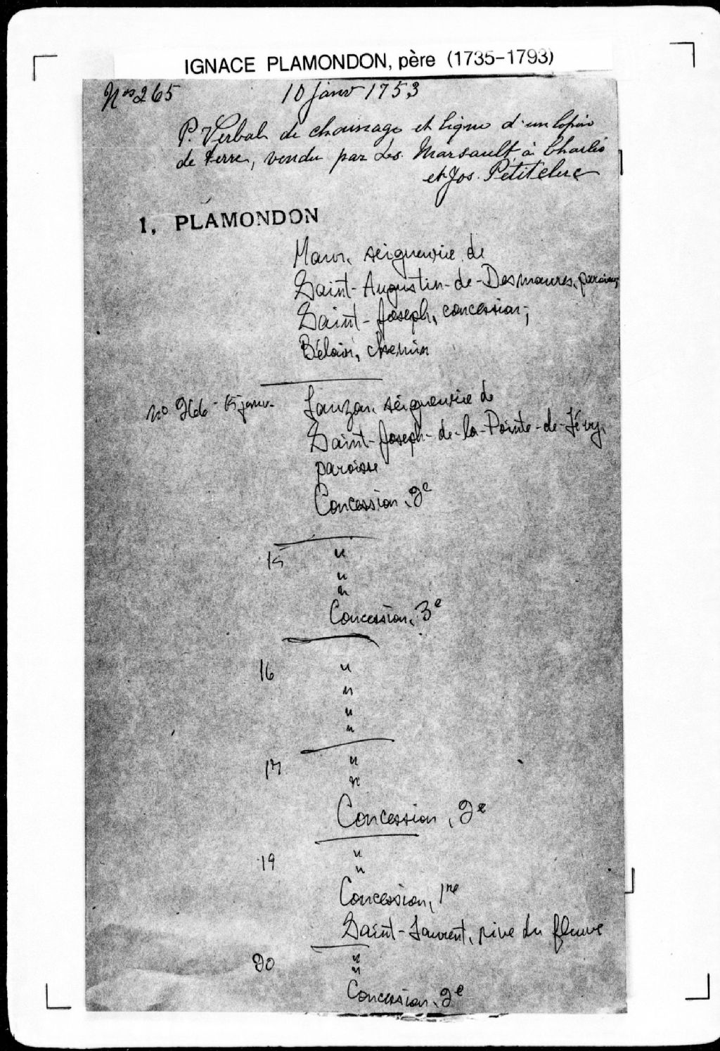 - Procès-verbal de chaînage, ligne et bornes de la profondeur de la troisième concession, laquelle ligne servant de ceinture à deux terres et de front à deux autres, lesquelles terres étant situées à la troisième concession (pour les Aubert) et à la quatrième concession (pour Breton et Guay), dans la [paroisse de Saint-Joseph-de-la-Pointe-de-Lévy], seigneurie de Lauzon.