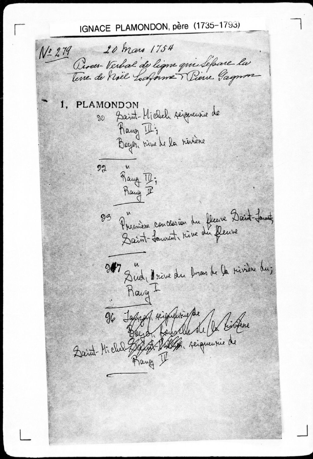 Procès-verbal de ligne et bornes séparant deux terres situées à la quatrième concession, dans la seigneurie de Saint-Michel. La présente pièce concerne directement: Prisque Bélanger, habitant de Saint-Vallier; Pierre Bolduc, habitant de Saint-Vallier (arpenteur Ignace Plamondon père), 26 mars 1754, Archives nationales à Québec, Fonds Cour supérieure. District judiciaire de Québec. Greffes d'arpenteurs, (03Q,CA301,S43,P279-5).