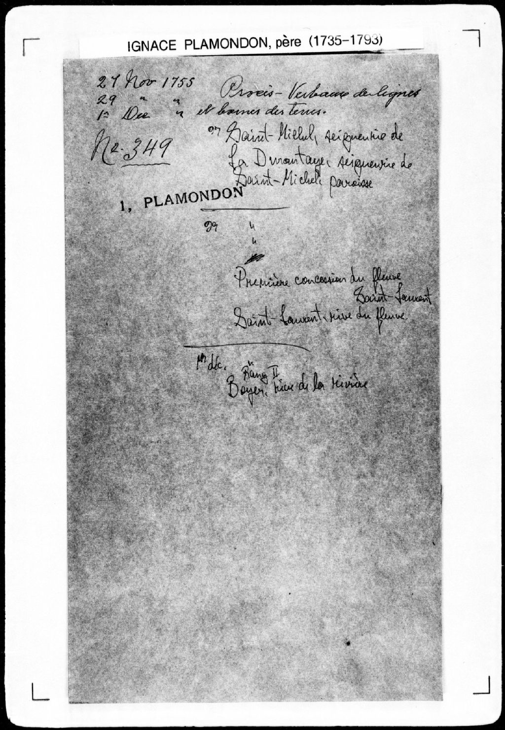 - Procès-verbal de ligne et bornes séparant deux terres depuis le fleuve Saint-Laurent jusqu'à la profondeur, lesquelles terres étant situées à la première concession, sur le fleuve Saint-Laurent, près du chemin Royal, dans la paroisse de Saint-Michel, seigneurie de Saint-Michel-de-La-Durantaye.