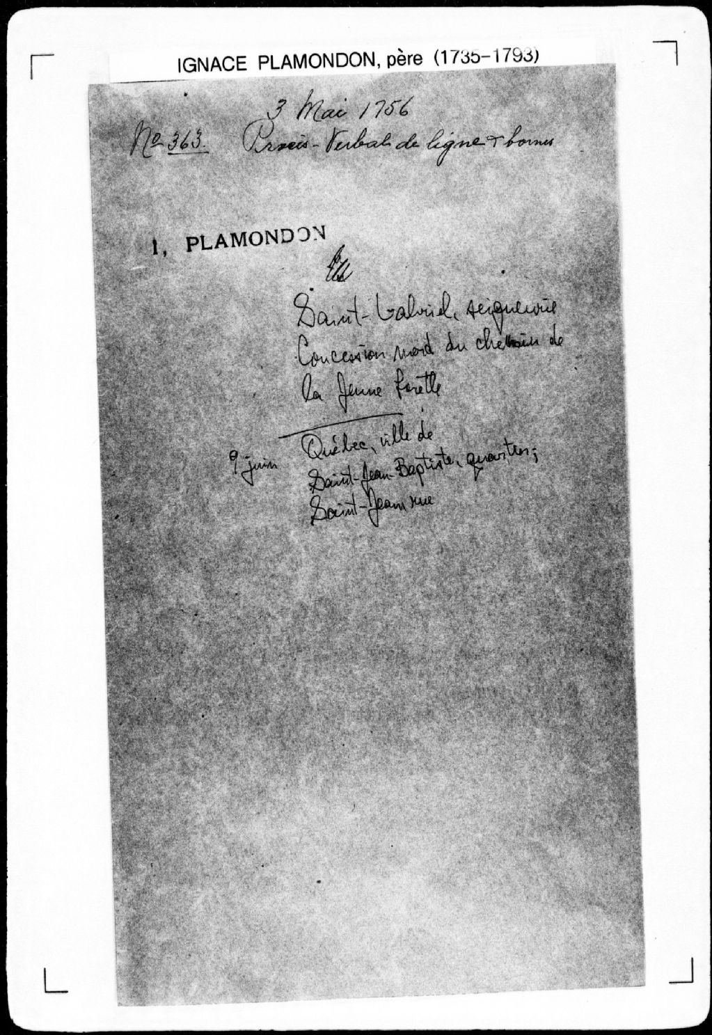 Procès-verbal de mesurage de six emplacements situés rue Saint-Jean, dans le faubourg de Québec. La présente pièce concerne directement: Pierre Leboeuf; Joseph Bouivin (Boivin); François Morin; Pierre Drolet; François Gygau (Gigaud, Gigault, Gigot); Pierre Chupin (arpenteur Ignace Plamondon père), 9 juin 1756, Archives nationales à Québec, Fonds Cour supérieure. District judiciaire de Québec. Greffes d'arpenteurs, (03Q,CA301,S43,P363-2).