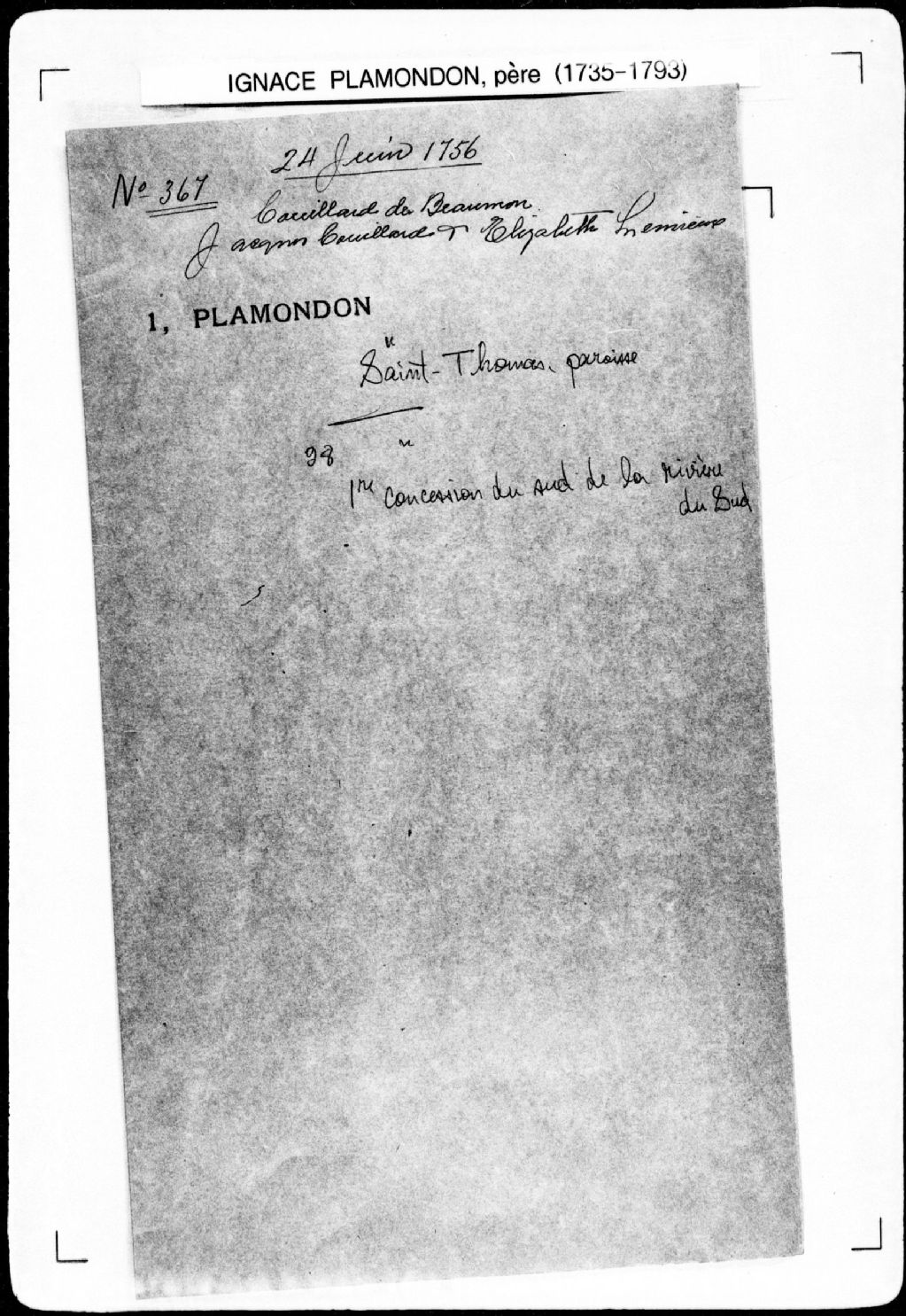 Procès-verbal de chaînage, lignes et bornes de trois terres situées au sud-est de la rivière du Sud, dans la seigneurie de la Rivière-du-Sud. La présente pièce concerne directement: Pierre Fournier; François Morin dit Valcour (Valcourt); Joseph Bouchard (arpenteur Ignace Plamondon père), 28 juin 1756, Archives nationales à Québec, Fonds Cour supérieure. District judiciaire de Québec. Greffes d'arpenteurs, (03Q,CA301,S43,P367-2).