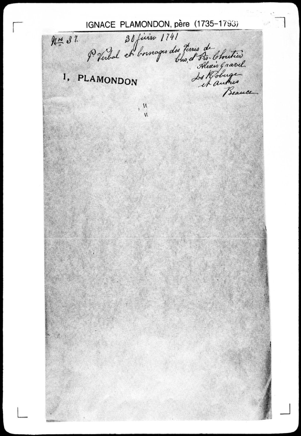 Procès-verbal de chaînage, lignes et bornes de six terres situées en la Nouvelle-Beauce, le long de la rivière du saut de la Chaudière, au sud-ouest de ladite rivière, dans la seigneurie de Rigaud-de-Vaudreuil. La présente pièce concerne directement: Charles Cloutier; François Cloutier; Alexis Gravelle (Gravel); le sieur Daine, greffier en chef au Conseil supérieur de Québec; Louis Roberge; Guillaume Gausselin (Gosselin) (arpenteur Ignace Plamondon père), 30 juin 1741, Archives nationales à Québec, Fonds Cour supérieure. District judiciaire de Québec. Greffes d'arpenteurs, (03Q,CA301,S43,P37-1).