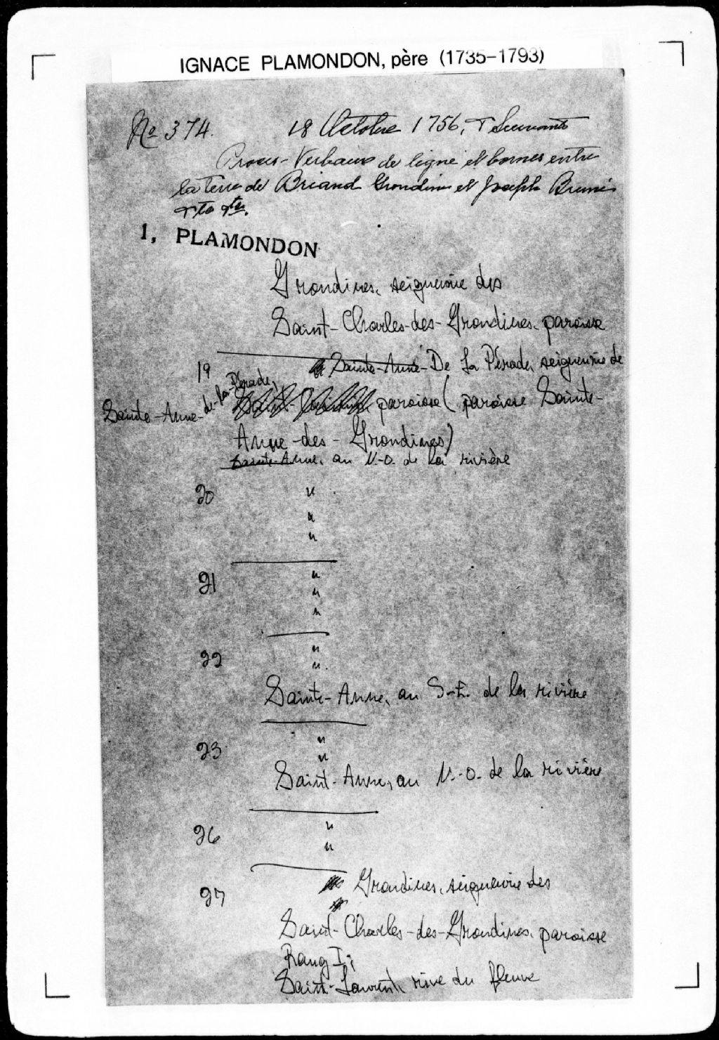 - Procès-verbal de partage d'une terre entre les héritiers de feue Marguerite Campagna, de chaînage, lignes et bornes des portions et de leur répartition entre lesdits héritiers, laquelle terre étant située au nord-ouest de la rivière Sainte-Anne, dans la paroisse de Sainte-Anne, seigneurie de Sainte-Anne-[de-la-Pérade].