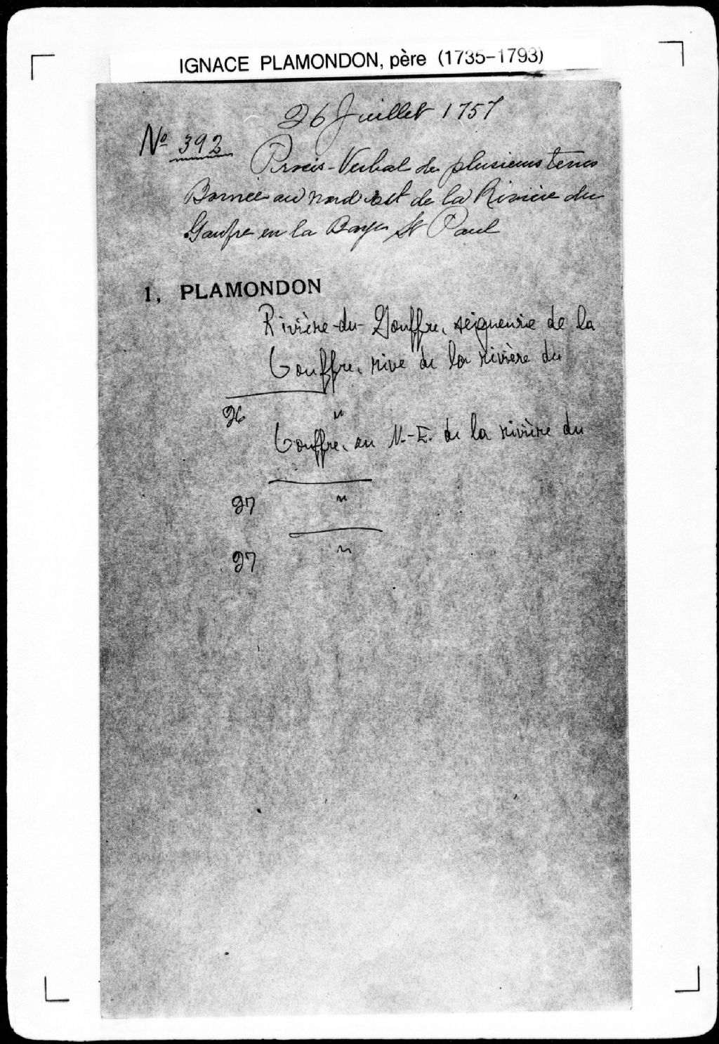 Procès-verbal de ligne et bornes séparant deux terres situées au nord-est de la rivière du Gouffre, à la Baie-Saint-Paul, dans la [seigneurie de la Rivière-du-Gouffre]. La présente pièce concerne directement: Nicolas Girard; Marc Perron (arpenteur Ignace Plamondon père), 27 juillet 1757, Archives nationales à Québec, Fonds Cour supérieure. District judiciaire de Québec. Greffes d'arpenteurs, (03Q,CA301,S43,P392-4).