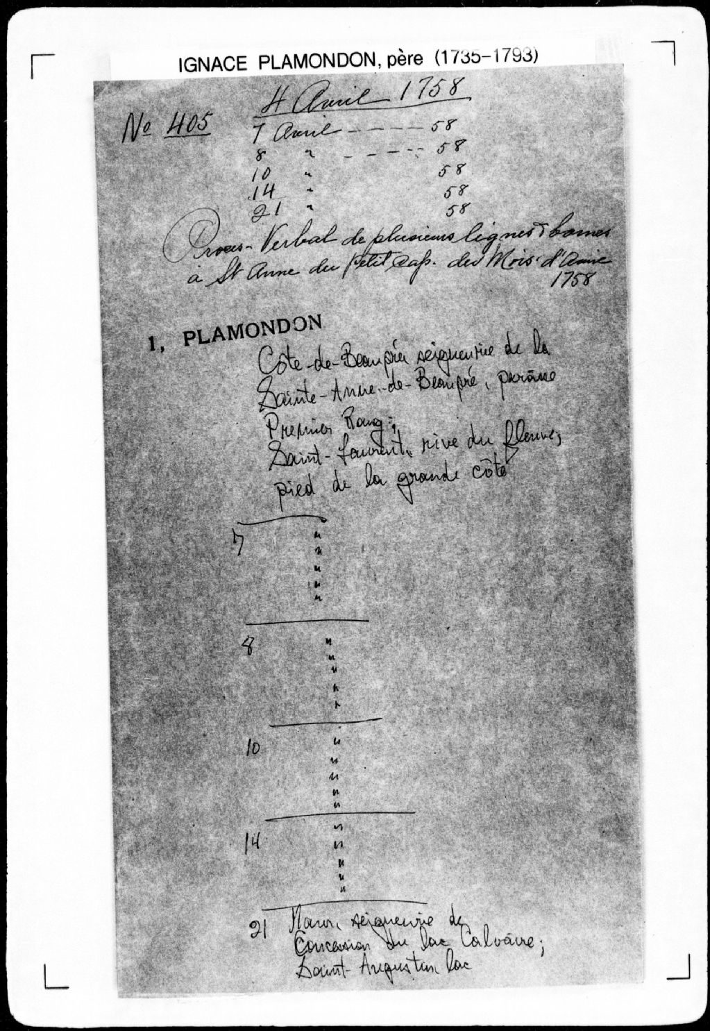 Procès-verbal de chaînage, ligne et borne de trois terres depuis le fleuve Saint-Laurent jusqu'au pied des grandes côtes, lesquelles terres étant situées à la première concession, sur le fleuve Saint-Laurent, dans la [paroisse Sainte-Anne], [seigneurie de la Côte-de-Beaupré]. La présente pièce concerne directement: Joseph Mersier (Mercier); [Ignace] Caron; [Jean] Caron; Charles Giguire (Giguère) (arpenteur Ignace Plamondon père), 7 avril 1758, Archives nationales à Québec, Fonds Cour supérieure. District judiciaire de Québec. Greffes d'arpenteurs, (03Q,CA301,S43,P405-2).
