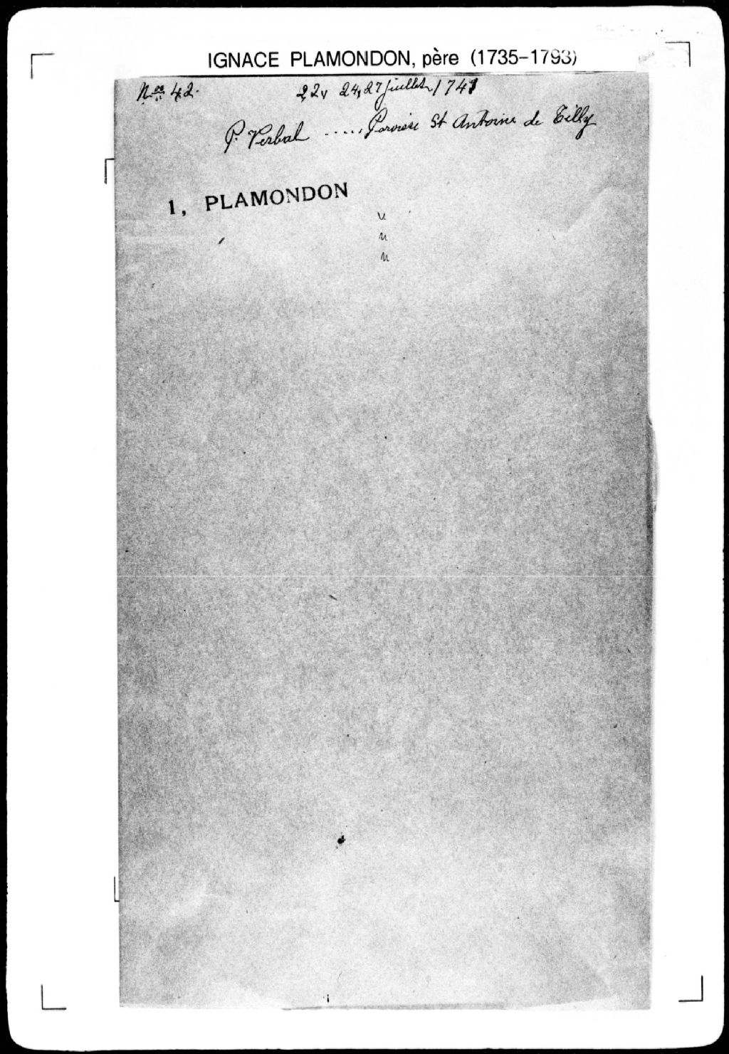 Procès-verbal de ligne séparant deux terres depuis la grève jusqu'à la grosse Rivière, lesquelles terres étant situées sur la grève, dans la [paroisse de Saint-Antoine], dans le [fief Duquet]. La présente pièce concerne directement: Joseph Croteau; Jacques Croteau (arpenteur Ignace Plamondon père), 22 juillet 1741, Archives nationales à Québec, Fonds Cour supérieure. District judiciaire de Québec. Greffes d'arpenteurs, (03Q,CA301,S43,P42-2).