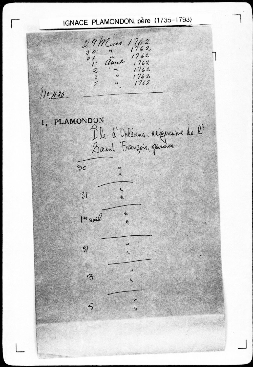 Procès-verbal de ligne et borne séparant deux terres depuis le fleuve Saint-Laurent jusqu'au milieu de l'île d'Orléans, lesquelles terres étant situées à l'île d'Orléans, sur le fleuve Saint-Laurent, près du chemin Royal, dans la paroisse de Saint-François, dans l'[arrière-fief d']Argentenay, [seigneurie de l'Île-d'Orléans]. La présente pièce concerne directement: François Dupon (Dupont); Charles Verrieur (Vérieu, Veilleux, Vérieul) (arpenteur Ignace Plamondon père), 1er avril 1762, Archives nationales à Québec, Fonds Cour supérieure. District judiciaire de Québec. Greffes d'arpenteurs, (03Q,CA301,S43,P435-4).