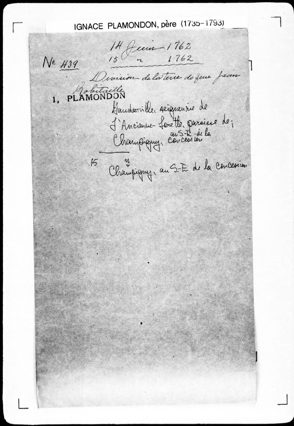 Procès-verbal de chaînage et ligne de deux terres depuis le trait-carré jusqu'au sud-est du ruisseau des Prairies, lesquelles terres étant situées au sud-est de la côte Champigny, sur une terre nommée la terre des Prairies, dans la paroisse de L'Ancienne-Lorette, seigneurie de Gaudarville. La présente pièce concerne directement: Gabriel Bellot dit Larose (Belleau); les enfants mineurs de feu Jean Robitale (Robitaille), époux de feue Marguerite Drolet (arpenteur Ignace Plamondon père), 14 juin 1762, Archives nationales à Québec, Fonds Cour supérieure. District judiciaire de Québec. Greffes d'arpenteurs, (03Q,CA301,S43,P439-1).