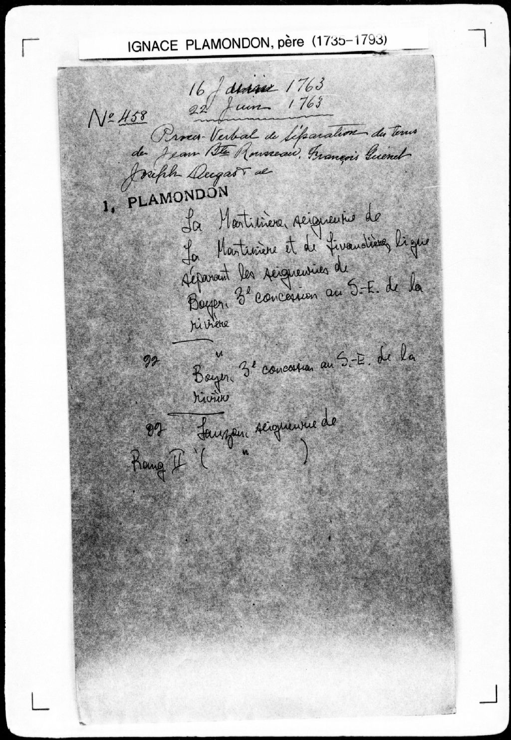 Procès-verbal de chaînage, lignes et bornes de deux terres situées au troisième rang, dans la seigneurie de La Martinière. La présente pièce concerne directement: Antoine Frélié; Georges Bouche (Boucher) (arpenteur Ignace Plamondon père), 22 juin 1763, Archives nationales à Québec, Fonds Cour supérieure. District judiciaire de Québec. Greffes d'arpenteurs, (03Q,CA301,S43,P458-2).
