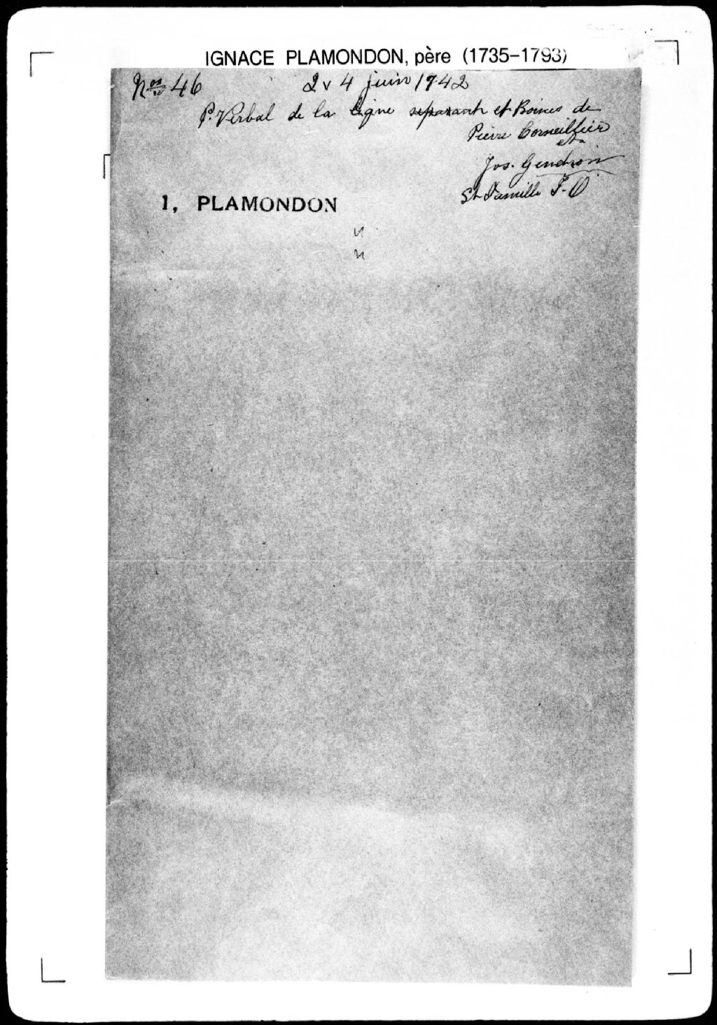 Procès-verbal de ligne séparant deux terres depuis la grève jusque proche le milieu de l'île d'Orléans, lesquelles terres étant situées à l'île d'Orléans, dans la paroisse de la Sainte-Famille, seigneurie de l'Île-d'Orléans. La présente pièce concerne directement: Pierre Cornellier (Cornelier), habitant de la Sainte-Famille, père de Joseph Cornellier; Joseph Gendron, habitant de la Sainte-Famille (arpenteur Ignace Plamondon père), 2 juin 1742, Archives nationales à Québec, Fonds Cour supérieure. District judiciaire de Québec. Greffes d'arpenteurs, (03Q,CA301,S43,P46-2).