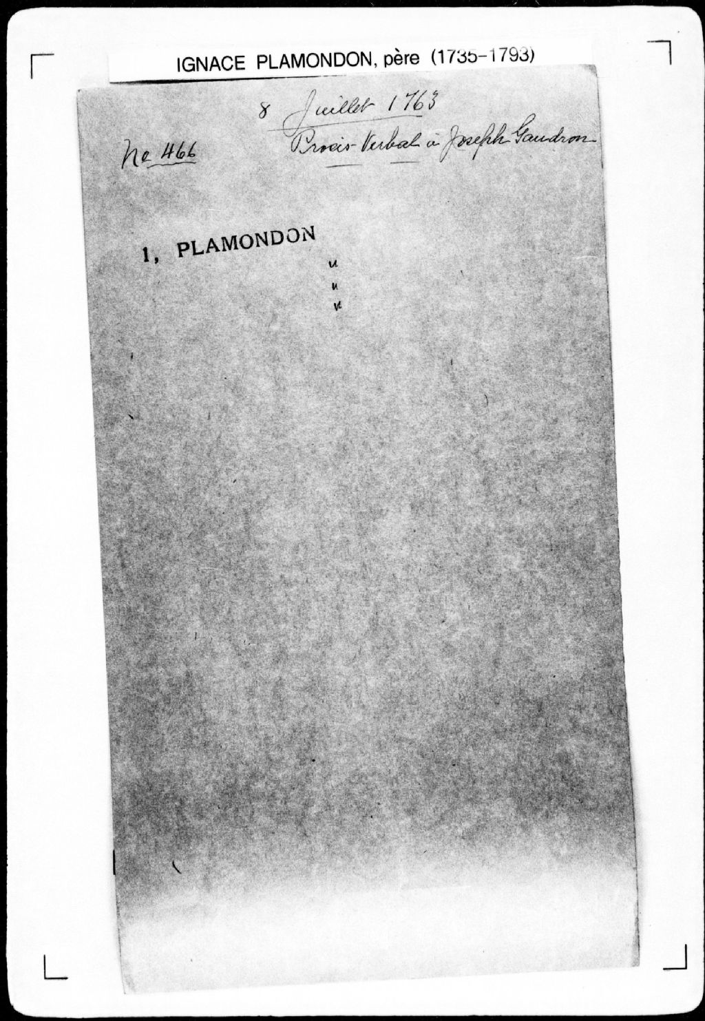 Procès-verbal de chaînage d'une terre et de lignes et bornes la séparant d'avec les terres voisines, lesquelles terres étant situées au lieu nommé la pointe de Boisclair (Boisclerc), au sud-est de la rivière des Étroits-Chemins (Etchemin), dans la seigneurie de Lauzon. La présente pièce concerne directement: Joseph Gandron (Gaudron, Gendron); Pierre Fontaine; Jean Fontaine (arpenteur Ignace Plamondon père), 8 juillet 1763, Archives nationales à Québec, Fonds Cour supérieure. District judiciaire de Québec. Greffes d'arpenteurs, (03Q,CA301,S43,P466).