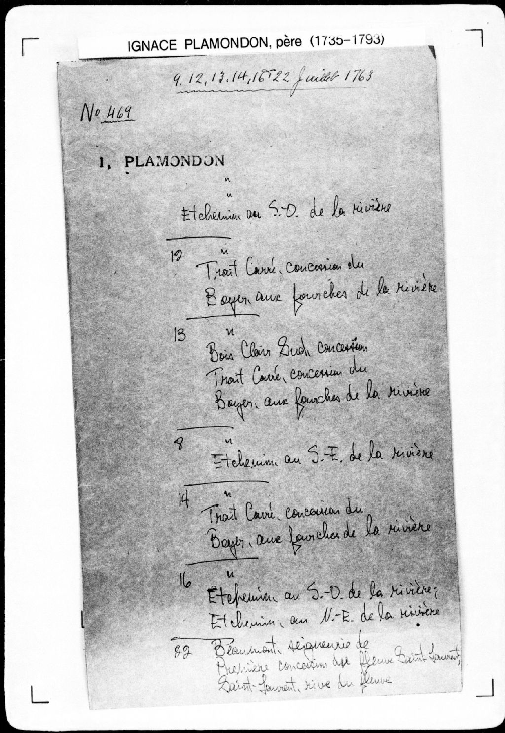 Procès-verbal de chaînage, lignes et bornes de six terres situées au sud-est de la rivière des Étroits-Chemins (Etchemin), dans la seigneurie de Lauzon. La présente pièce concerne directement: Jean-Baptiste Malbeuf (Malboeuf); Joseph Fontaine; Augustin Blaid (Blais); Pierre Fontaine; Jean Fontaine; Joseph Gandron (Gaudron, Gendron) (arpenteur Ignace Plamondon père), 8 juillet 1763, Archives nationales à Québec, Fonds Cour supérieure. District judiciaire de Québec. Greffes d'arpenteurs, (03Q,CA301,S43,P469-4).