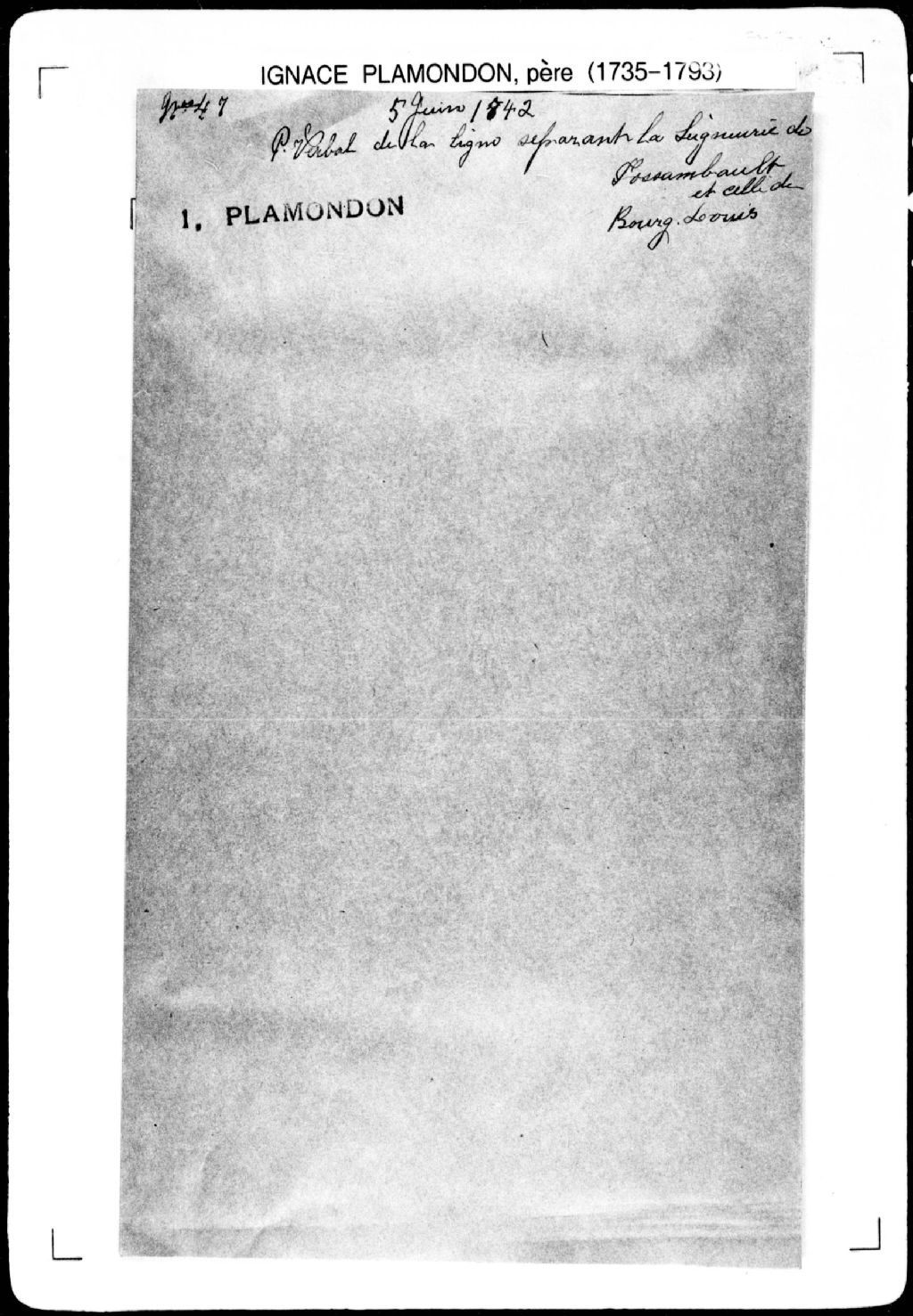 Procès-verbal de ligne séparant la seigneurie de Bourg-Louis et la seigneurie de Fossambault à partir de la ligne qui sépare la seigneurie de Neuville de la seigneurie de Fossambault et à la borne qui termine la seigneurie de Neuville et qui commence la seigneurie de Bourg-Louis, jusqu'à la rivière Portneuf, puis jusqu'à la rivière Sainte-Anne.