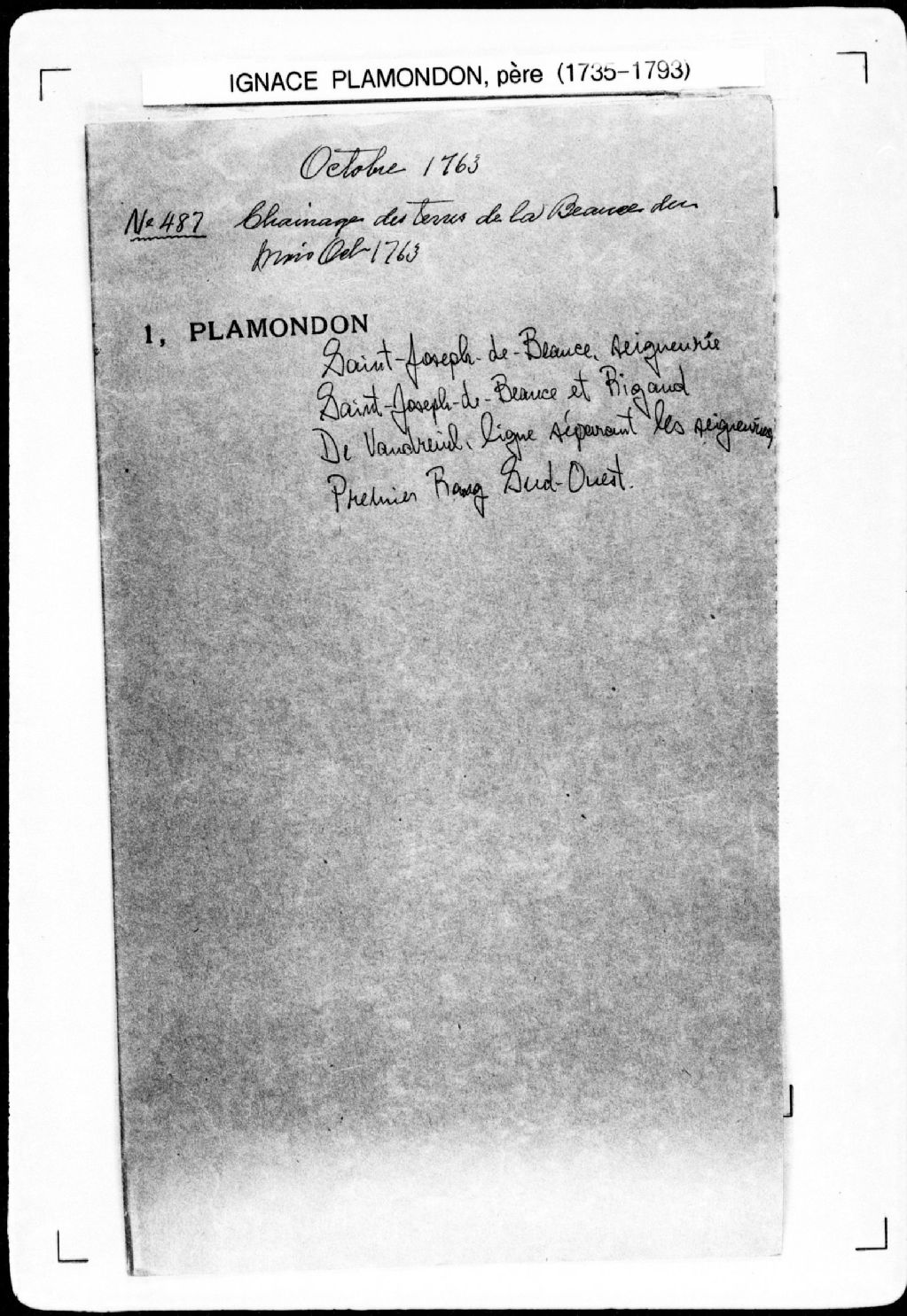 - Liste d'habitants de la seigneurie de Fleury [seigneurie de Saint-Joseph-de-Beauce] avec la quantité d'arpents de terre de front qu'ils occupent, lesquelles terres étant situées à la Nouvelle-Beauce, à commencer au sud-ouest de la rivière du saut de la Chaudière et ce au bras du Sud-Ouest qui fait la borne entre ladite seigneurie de Fleury (Saint-Joseph-de-Beauce) et la seigneurie de [Rigaud-de-Vaudreuil] (arpenteur Ignace Plamondon père)