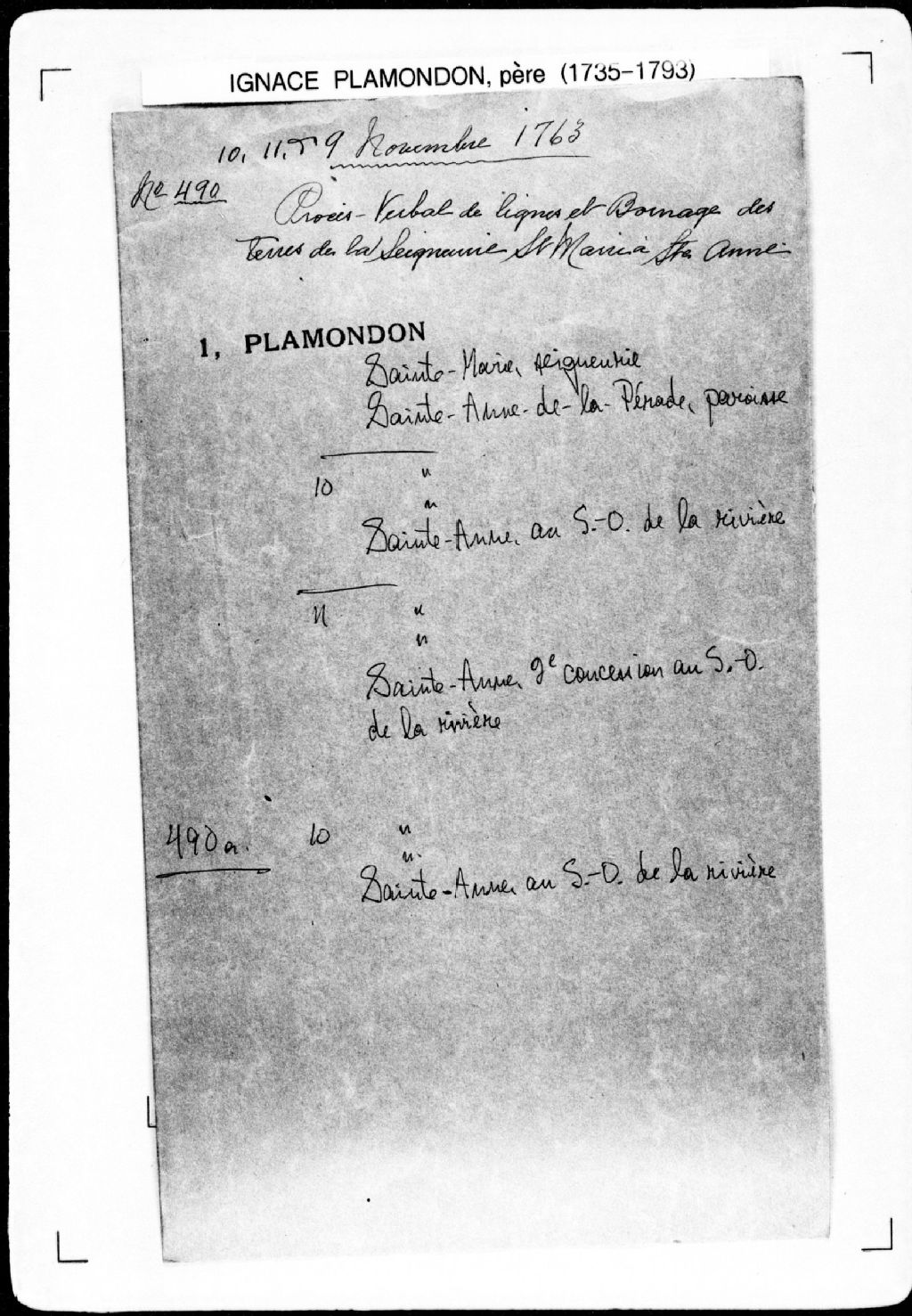 Procès-verbal de chaînage, ligne et bornes d'une terre située dans la seigneurie de Sainte-Marie (Les Chenaux). La présente pièce concerne directement: Jean Perain (Perrin) (arpenteur Ignace Plamondon père), 9 novembre 1763, Archives nationales à Québec, Fonds Cour supérieure. District judiciaire de Québec. Greffes d'arpenteurs, (03Q,CA301,S43,P490-1).