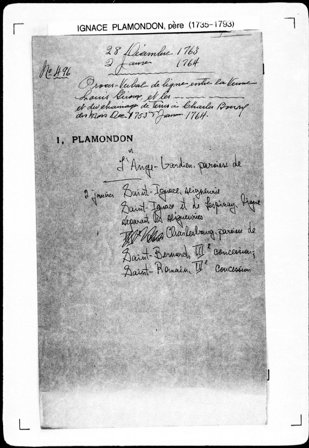 - Procès-verbal de ligne séparant deux concessions et servant de ceinture à la côte Saint-Bernard et de front à la côte Saint-Romain à partir d'une borne de pierre posée sur la route qui sépare lesdites côtes, jusqu'à la ligne qui sépare la seigneurie de Saint-Ignace et la seigneurie de Lespinay, lesquelles concessions étant situées dans la seigneurie de Saint-Ignace.