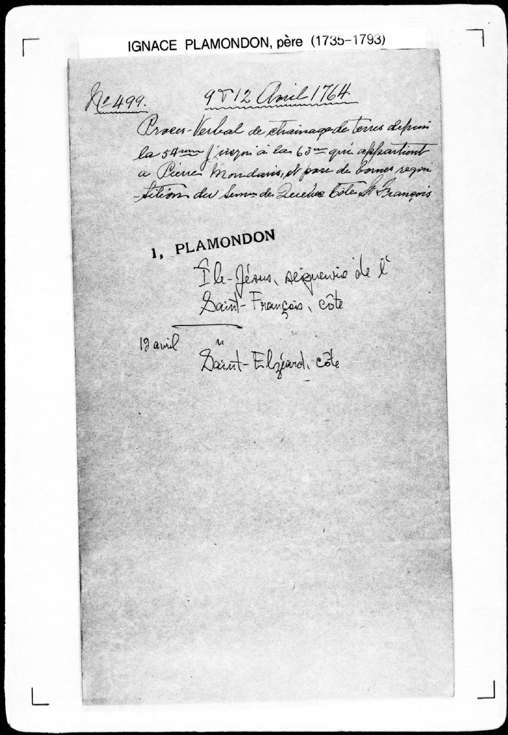 Procès-verbal de chaînage, lignes et bornes de neuf terres situées à la côte Saint-François, dans la seigneurie de l'Île-Jésus. La présente pièce concerne directement: le Séminaire de Québec; Pierre Mondarie (Mondary, Mondare, Mondery) (arpenteur Ignace Plamondon père), 9 avril 1764 - 11 avril 1764, Archives nationales à Québec, Fonds Cour supérieure. District judiciaire de Québec. Greffes d'arpenteurs, (03Q,CA301,S43,P499-1).
