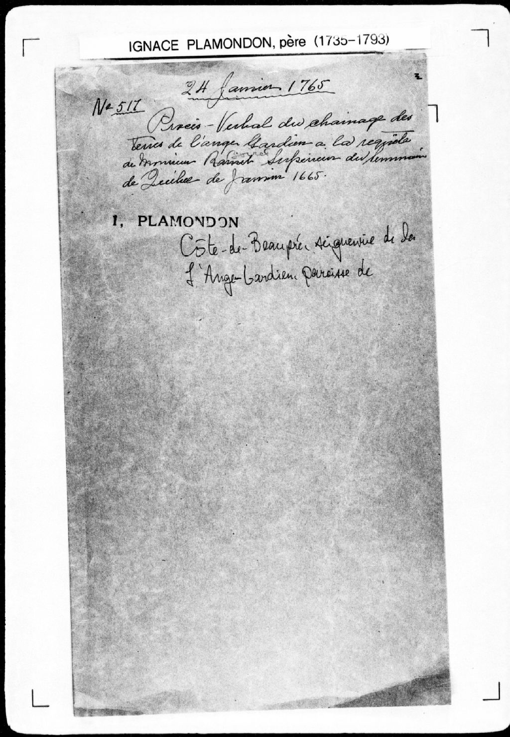 Procès-verbal de chaînage de la profondeur de deux terres situées sur le fleuve Saint-Laurent, dans la paroisse de L'Ange-Gardien, seigneurie de la Côte-de-Beaupré. La présente pièce concerne directement: Charles Marette dit Lépine (Maret); François Marette dit Lépine (Marette); Jean Giroux; Louis Giroux (arpenteur Ignace Plamondon père), 24 janvier 1765 - 26 janvier 1765, Archives nationales à Québec, Fonds Cour supérieure. District judiciaire de Québec. Greffes d'arpenteurs, (03Q,CA301,S43,P517).