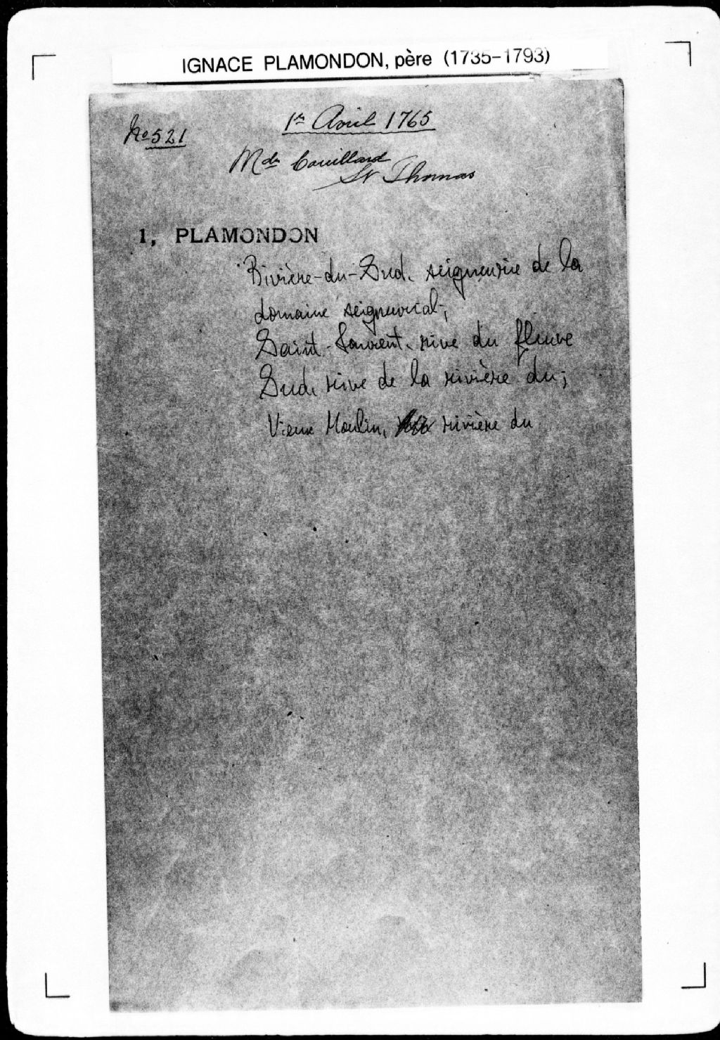 Procès-verbal de chaînage du domaine seigneurial, de son partage, d'échange de terre entre les parties et de chaînage, ligne et bornes des portions, lequel domaine étant situé sur le fleuve Saint-Laurent et borné à l'est par la rivière du Sud et au sud-ouest par la rivière des Vases, dans la seigneurie de la Rivière-du-Sud., 1er avril 1765, Archives nationales à Québec, Fonds Cour supérieure. District judiciaire de Québec. Greffes d'arpenteurs, (03Q,CA301,S43,P521).