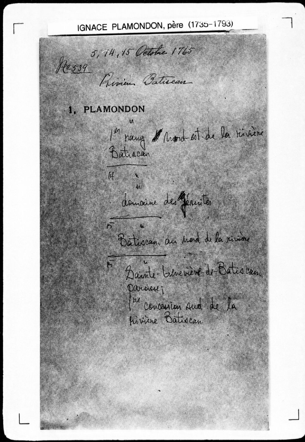 Procès-verbal de ligne et bornes séparant une terre d'avec le domaine seigneurial, lesquels terre et domaine étant situés au nord-est de la rivière de Batiscan, dans la seigneurie de Batiscan. La présente pièce concerne directement: Joseph Déry; le domaine de la seigneurie de Batiscan; les Révérends Pères Jésuites du Collège de Québec, seigneurs de Batiscan (arpenteur Ignace Plamondon père), 14 octobre 1765, Archives nationales à Québec, Fonds Cour supérieure. District judiciaire de Québec. Greffes d'arpenteurs, (03Q,CA301,S43,P539-2).