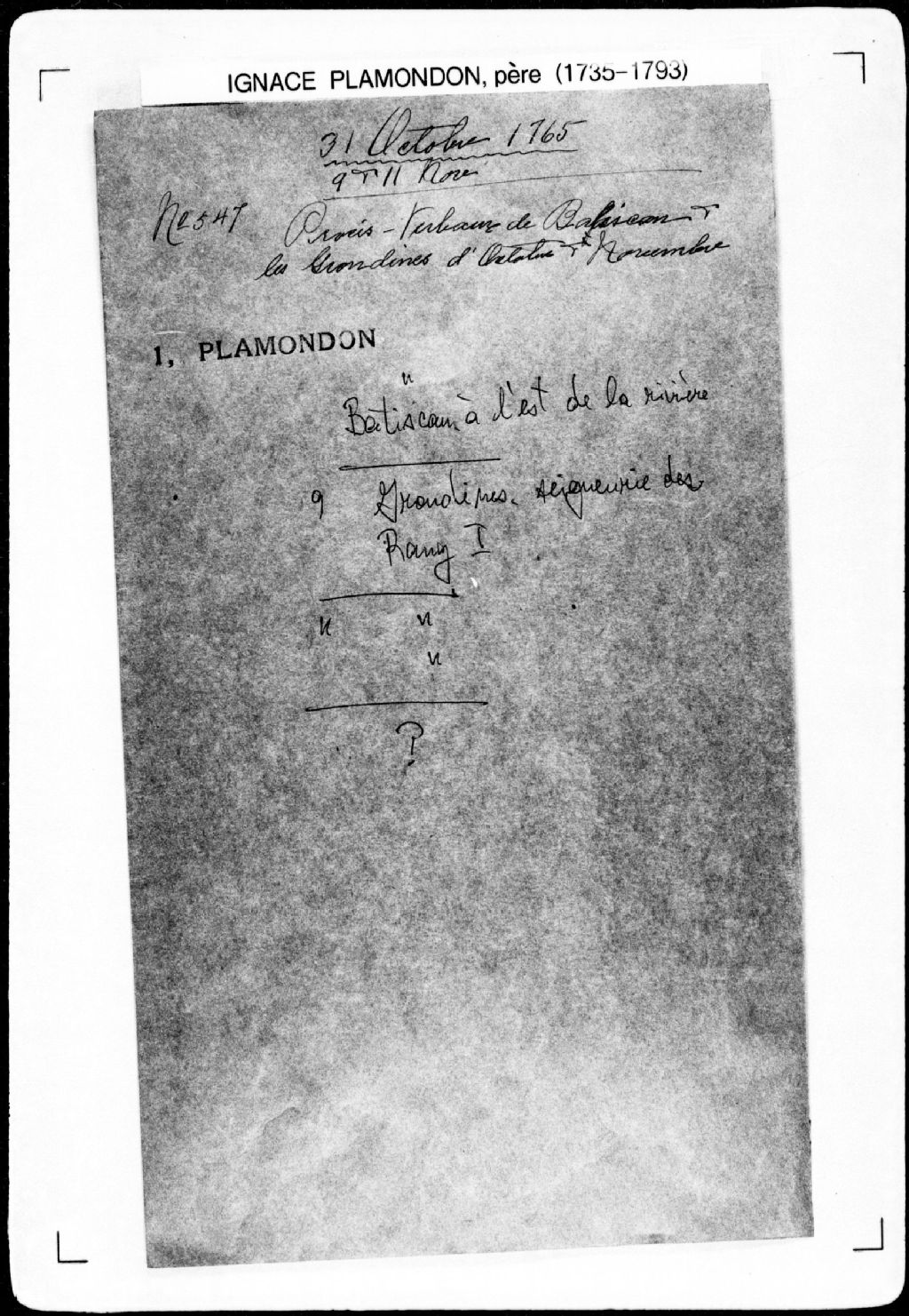 Procès-verbal de borne séparant deux terres situées dans la seigneurie des Grondines. La présente pièce concerne directement: [Antoine] Lecuier (L'Écuyer, Lécuyer); Denis Naud (Nault) (arpenteur Ignace Plamondon père), 11 novembre 1765, Archives nationales à Québec, Fonds Cour supérieure. District judiciaire de Québec. Greffes d'arpenteurs, (03Q,CA301,S43,P547-3).