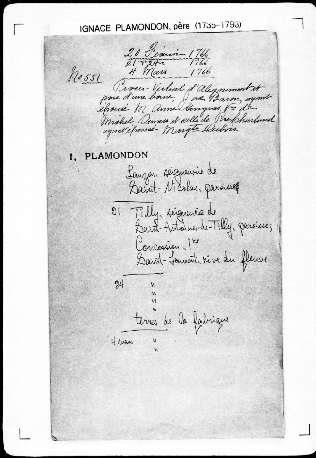 Procès-verbal de ligne et borne séparant deux terres situées à la côte de Lauzon, dans la paroisse de Saint-Nicolas, seigneurie de Lauzon. La présente pièce concerne directement: Jacques Baron, habitant de Saint-Nicolas, époux de Marie-Anne Gingra (Gingras), veuve de feu Michel Demer (Demers); Pierre Charlant (Charland), habitant de Saint-Nicolas, époux de Marguerite Dubois, veuve de feu Joseph Marion (arpenteur Ignace Plamondon père), 20 février 1766, Archives nationales à Québec, Fonds Cour supérieure. District judiciaire de Québec. Greffes d'arpenteurs, (03Q,CA301,S43,P551-1).