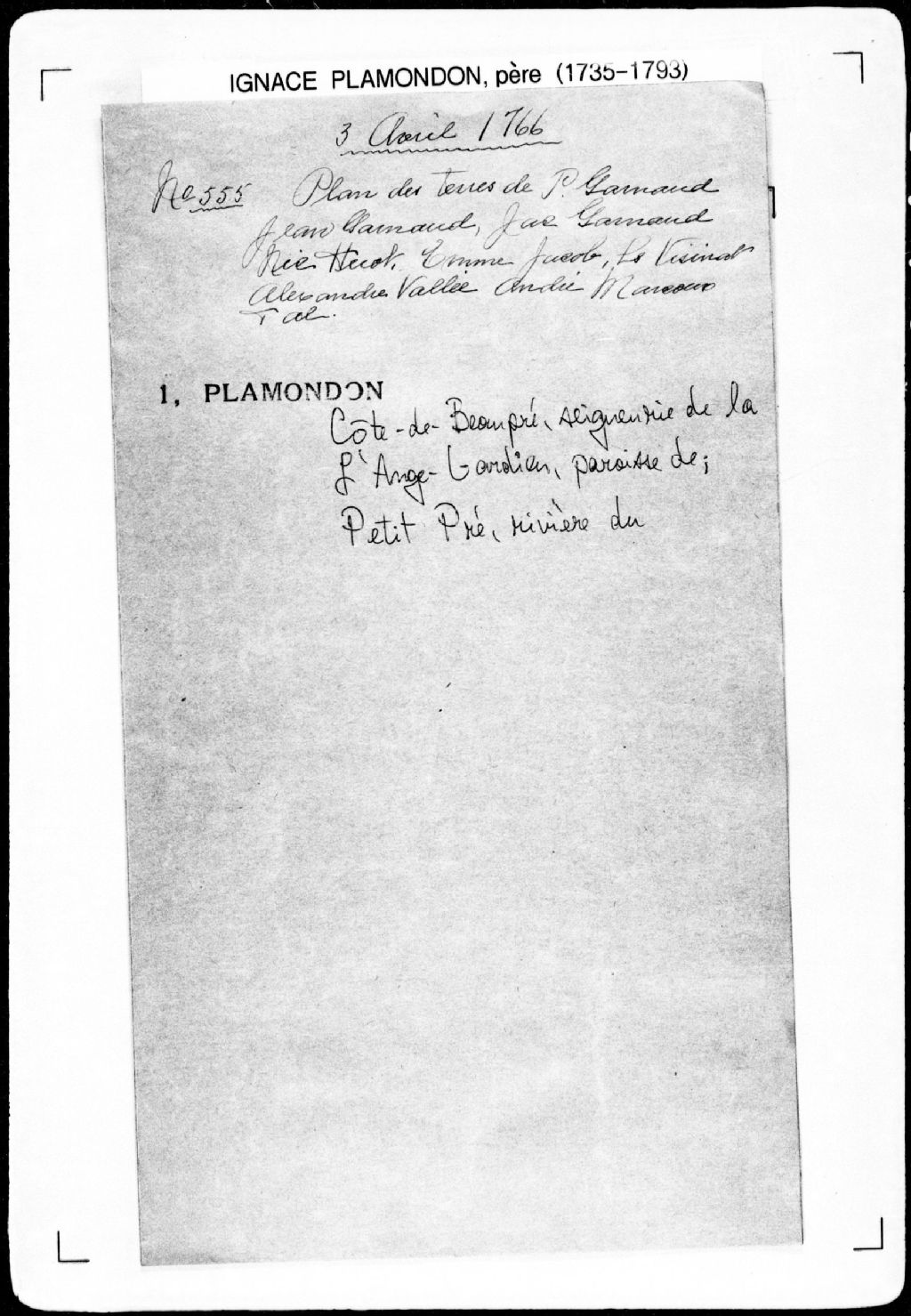 Plan figuratif de douze terres situées dans la paroisse de L'Ange-Gardien, seigneurie de la Côte-de-Beaupré. La présente pièce concerne directement: Pierre Garnaud (Garneau); Jean Garnaud (Garneau); Jacques Garnaud (Garneau); Michel Huot; Aimé Jacob; Louis Vesinat (Vézina); Alexandre Valle (Vallée); André Marcou (Marcoux); Nicolas Parant (Parent); Charles Vallé (Vallée); Jean Beaugit (Beaugis, Baugis) (arpenteur Ignace Plamondon père)