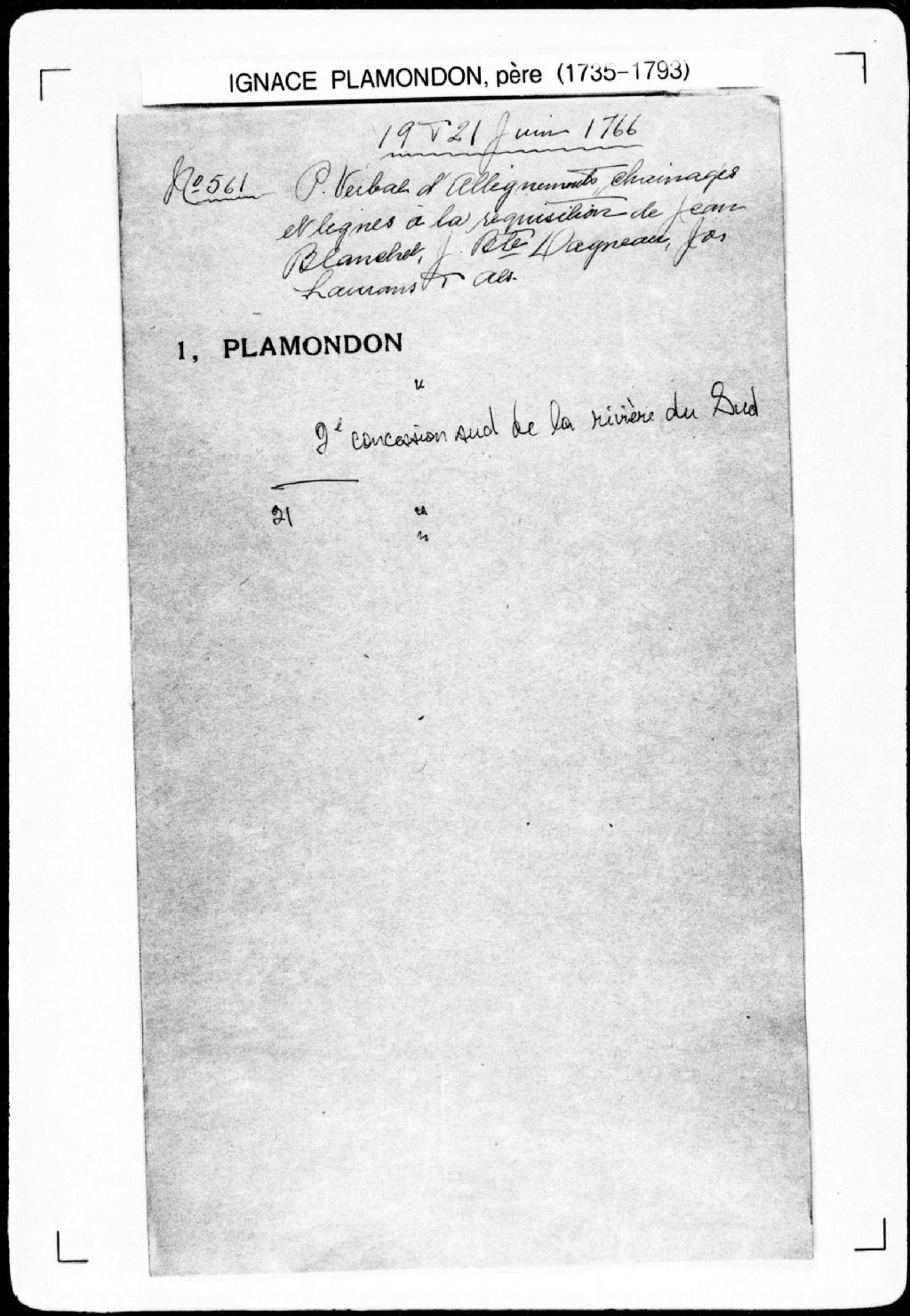 Procès-verbal de chaînage, lignes et bornes de six terres situées à la seconde concession, au sud-est de la rivière du Sud, dans la seigneurie de la Rivière-du-Sud. La présente pièce concerne directement: Jean-Baptiste Blanchet; Jean-Baptiste Dagnaux (Dagneau, Daniau, Daigneault); Joseph Lamars (Lamare, Lamarre); Germain Morin; Laurent Cloutier; Charles Mathieu (arpenteur Ignace Plamondon père), 19 juin 1766, Archives nationales à Québec, Fonds Cour supérieure. District judiciaire de Québec. Greffes d'arpenteurs, (03Q,CA301,S43,P561-1).
