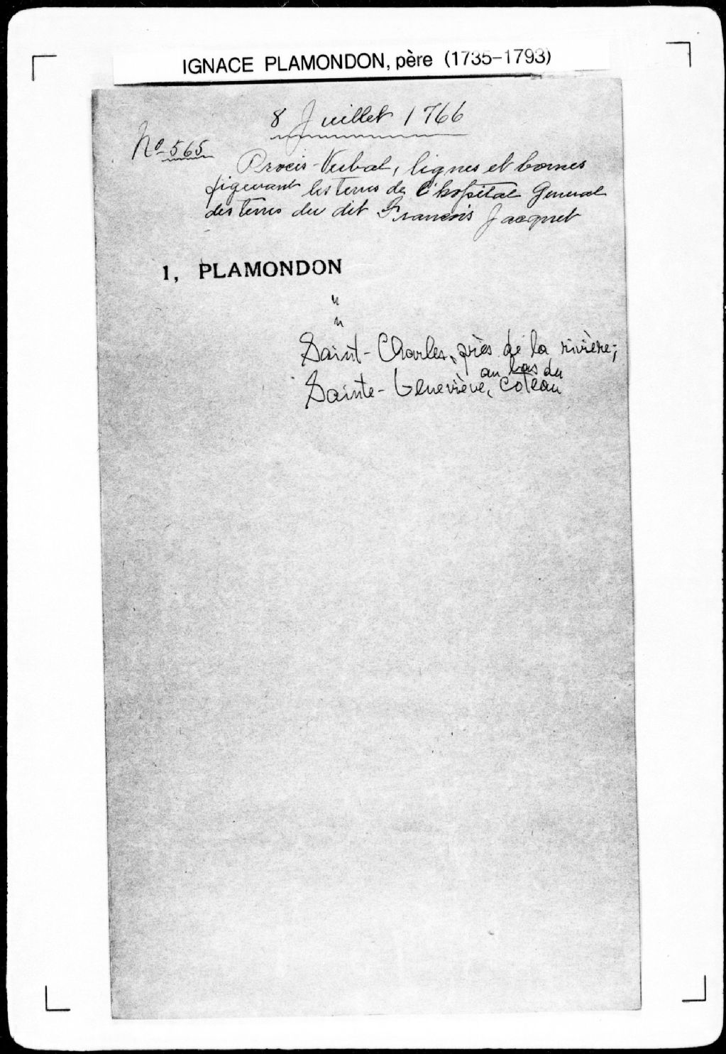Procès-verbal de ligne et bornes séparant deux terres situées près du chemin Royal, en la banlieue de Québec, sur les terres vulgairement nommées de Saint-Sauveur, au bas du coteau Sainte-Geneviève et près de la rivière Saint-Charles. La présente pièce concerne directement: François Jaquet (Jacquet), maître potier de terre, acquéreur des terres vulgairement nommées de Saint-Sauveur; les Dames Religieuses de l'Hôpital général de Québec (arpenteur Ignace Plamondon père), 8 juillet 1766, Archives nationales à Québec, Fonds Cour supérieure. District judiciaire de Québec. Greffes d'arpenteurs, (03Q,CA301,S43,P565).