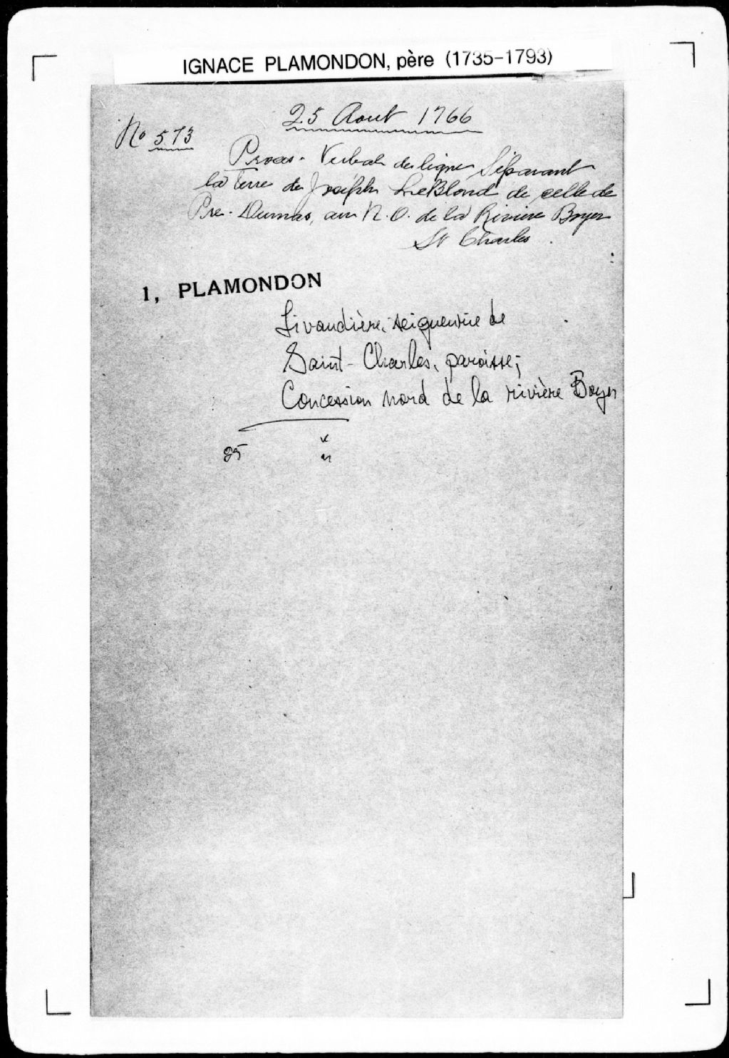 Procès-verbal de ligne et borne séparant deux terres situées dans la [paroisse de Saint-Charles], [seigneurie de Livaudière]. La présente pièce concerne directement: Pierre Charie (Charrier, Charier); Michel Morisset (Morissette) (arpenteur Ignace Plamondon père), 25 août 1766, Archives nationales à Québec, Fonds Cour supérieure. District judiciaire de Québec. Greffes d'arpenteurs, (03Q,CA301,S43,P573-2).