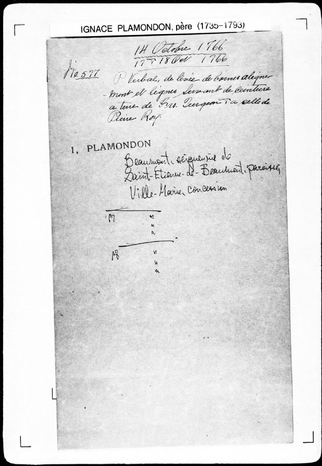 Procès-verbal de ligne séparant deux terres situées à la deuxième concession, dans la [paroisse de Saint-Étienne], [seigneurie de Beaumont]. La présente pièce concerne directement: Pierre Roy; André Turgeon, cousin de François Turgeon (arpenteur Ignace Plamondon père), 17 octobre 1766, Archives nationales à Québec, Fonds Cour supérieure. District judiciaire de Québec. Greffes d'arpenteurs, (03Q,CA301,S43,P577-2).