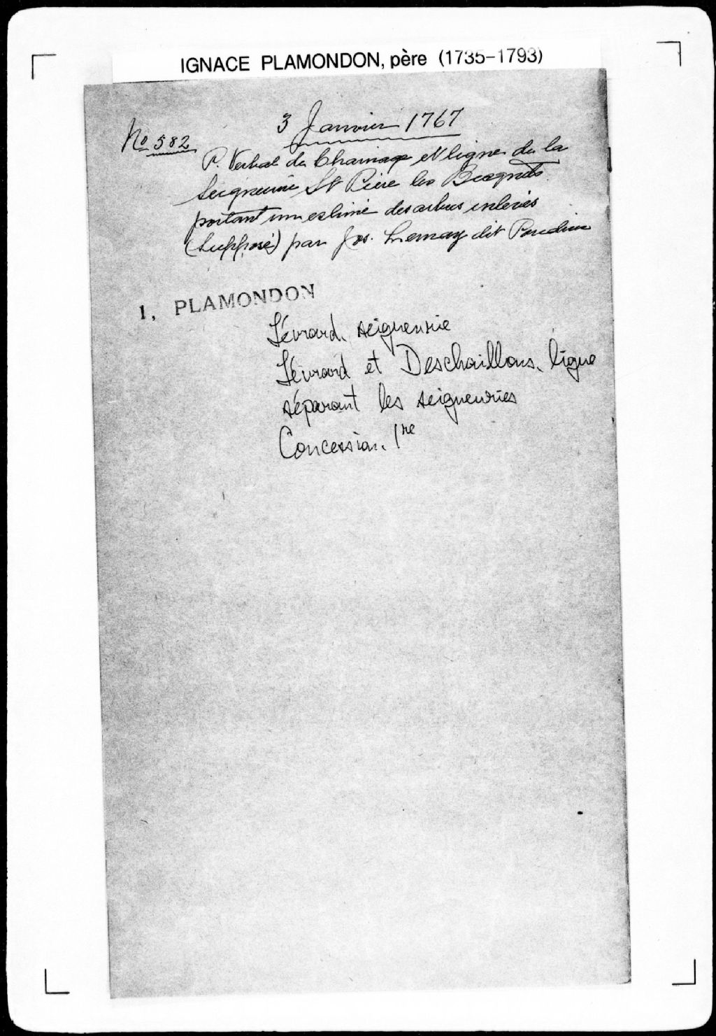 - Procès-verbal de ligne de la seigneurie de Levrard sur la ligne qui sépare la seigneurie de Deschaillons et ladite seigneurie de Levrard depuis le fleuve Saint-Laurent jusqu'à la petite rivière Duchesne.