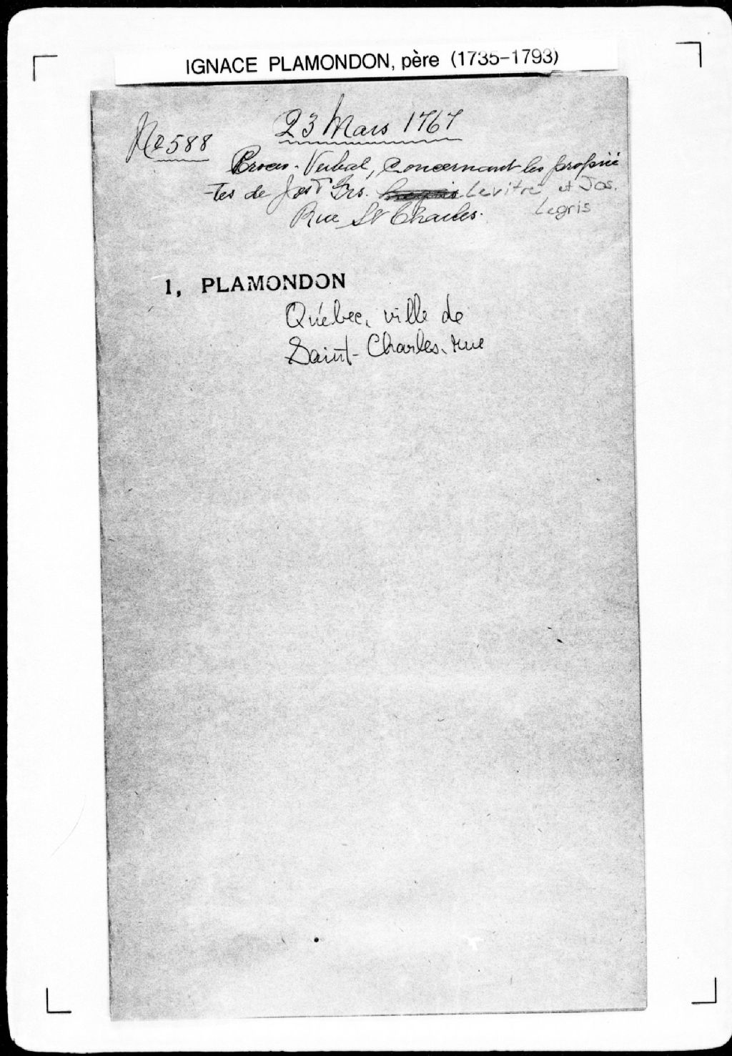 - La pièce se compose du procès-verbal de transport de l'arpenteur afin de procéder à l'arpentage de deux emplacements, en vertu d'un arrêt rendu par la Cour des Plaidoyers communs, en date du 27 octobre 1766, et de refus d'une des parties de procéder audit arpentage sous prétexte qu'un nouvel arrêt annule ledit arrêt du 27 octobre 1766, lesquels emplacements étant situés rue Saint-Charles, dans la ville de Québec. Elle concerne directement: Joseph Levitre; François Levitre; Joseph Legris.Nicolas Martin et Claude Legris semblent être les anciens propriétaires des emplacements appartenant auxdits Levitre et Legris.Les arpenteurs sont Ignace Plamondon père et Charles Vallée.