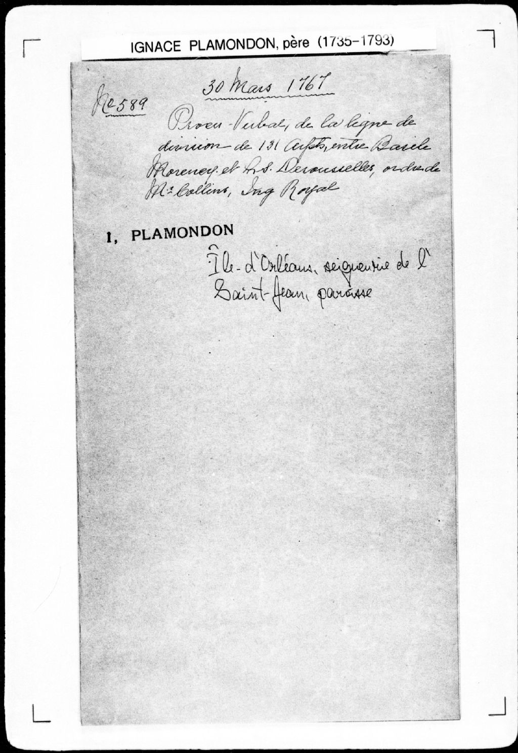 Procès-verbal de chaînage de l'île d'Orléans de grève en grève, de division de ladite île en deux et de ligne séparant les portions afin de séparer deux terres en profondeur, l'une au nord et l'autre au sud, en vertu d'un ordre du sieur Collins, ingénieur et arpenteur général en la province de Québec, lesquelles terres étant situées à l'île d'Orléans, sur le fleuve Saint-Laurent, dans la paroisse de Saint-Jean, seigneurie de l'Île-d'Orléans., 30 mars 1767 - 3 avril 1767, Archives nationales à Québec, Fonds Cour supérieure. District judiciaire de Québec. Greffes d'arpenteurs, (03Q,CA301,S43,P589).