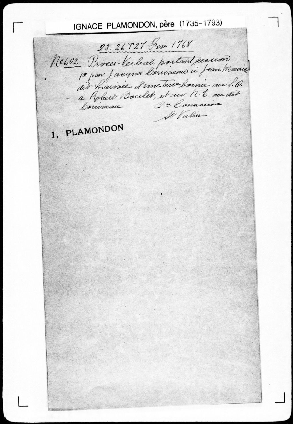 Procès-verbal de ligne et borne séparant deux terres depuis le fleuve Saint-Laurent jusqu'à la profondeur et de ligne de la profondeur d'une desdites terres, laquelle la séparant de la seconde concession, lesquelles terres étant situées à la première concession, sur le fleuve Saint-Laurent, près du chemin Royal, dans la seigneurie de Saint-Michel. La présente pièce concerne directement: Joseph Lacroix, fils et donataire de Gabriel Lacroix; André Plante (arpenteur Ignace Plamondon père), 26 février 1768, Archives nationales à Québec, Fonds Cour supérieure. District judiciaire de Québec. Greffes d'arpenteurs, (03Q,CA301,S43,P602-2).